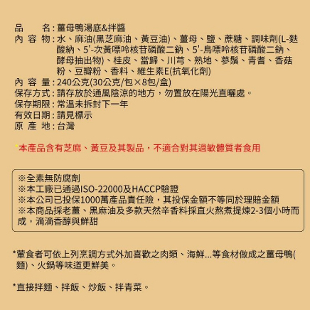 【自然緣素】薑母鴨湯底&拌醬-盒裝湯底(30gX8包/盒)【自然緣素】薑母鴨湯底&拌醬-盒裝湯底(30gX8包/盒)Stock, Gravy & Instant Soupe點紅