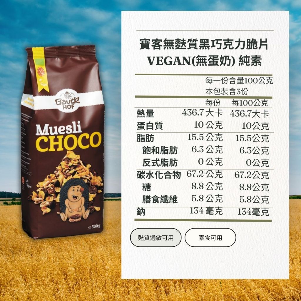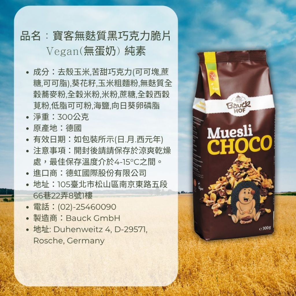 德國寶客BauckHof 無麩質黑巧克力脆片(無蛋奶) Frühstück Zartbitter 300g2025/09/23即期特價|2026/05/04Cereal, Granola & OatsDHI 德虹無麩質園地