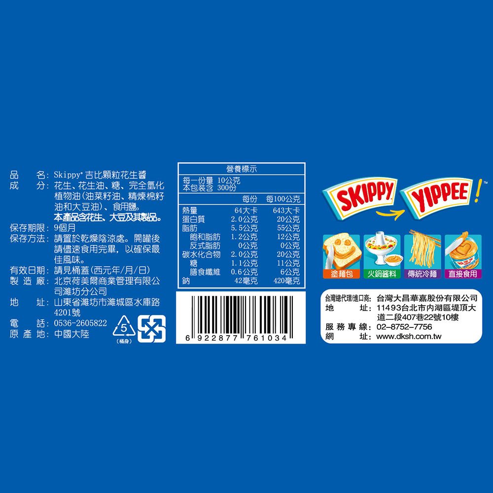 【SKIPPY】吉比 顆粒花生醬 3kg (餐飲專用)|台灣總代理直營1入Jam & SpreadDKSH 台灣大昌華嘉官方商城