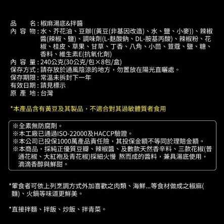 【自然緣素】椒麻湯底&拌醬-盒裝湯底(30gx8包/盒)【自然緣素】椒麻湯底&拌醬-盒裝湯底(30gx8包/盒)Stock, Gravy & Instant Soupe點紅