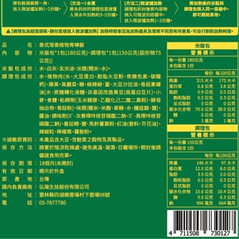 【弘陽食品】泰式塔香-植物青檸飯(330g/盒)-常溫保存【弘陽食品】泰式塔香-植物青檸飯(330g/盒)-常溫保存Instant Rice & Porridgee點紅