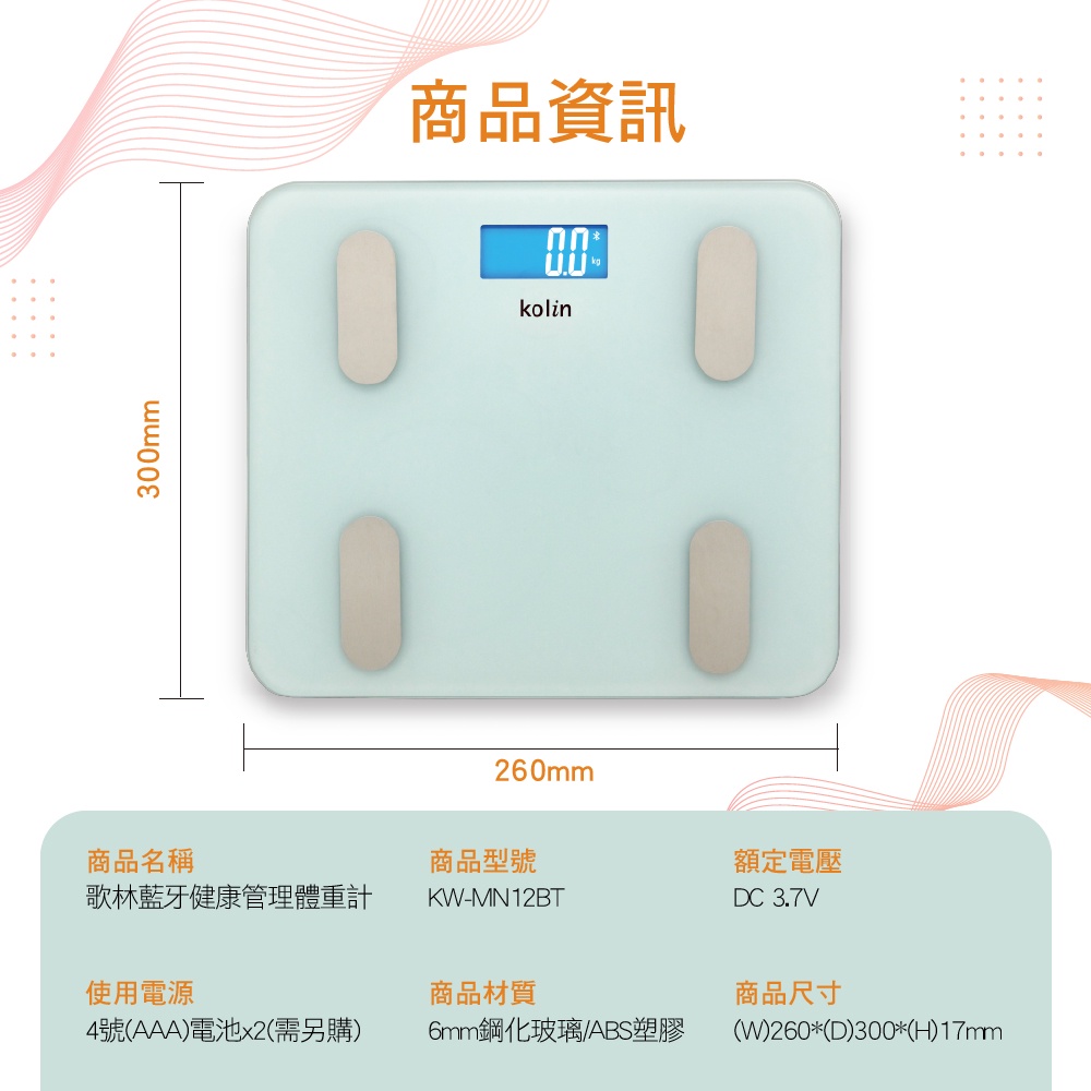【Kolin】歌林藍牙健康管理體重計KW-MN12BT 體重計 體重秤 體重機 電子秤 藍芽體重計 體脂測量機【Kolin】歌林藍牙健康管理體重計KW-MN12BT 體重計 體重秤 體重機 電子秤 藍芽體重計 體脂測量機Scale & Body Fat AnalyzersDiscovery Adventures 探索旗艦店