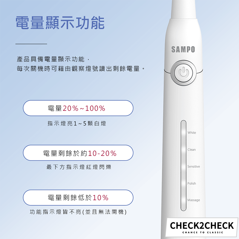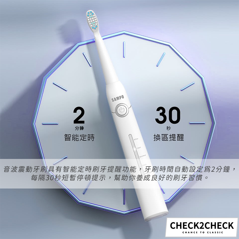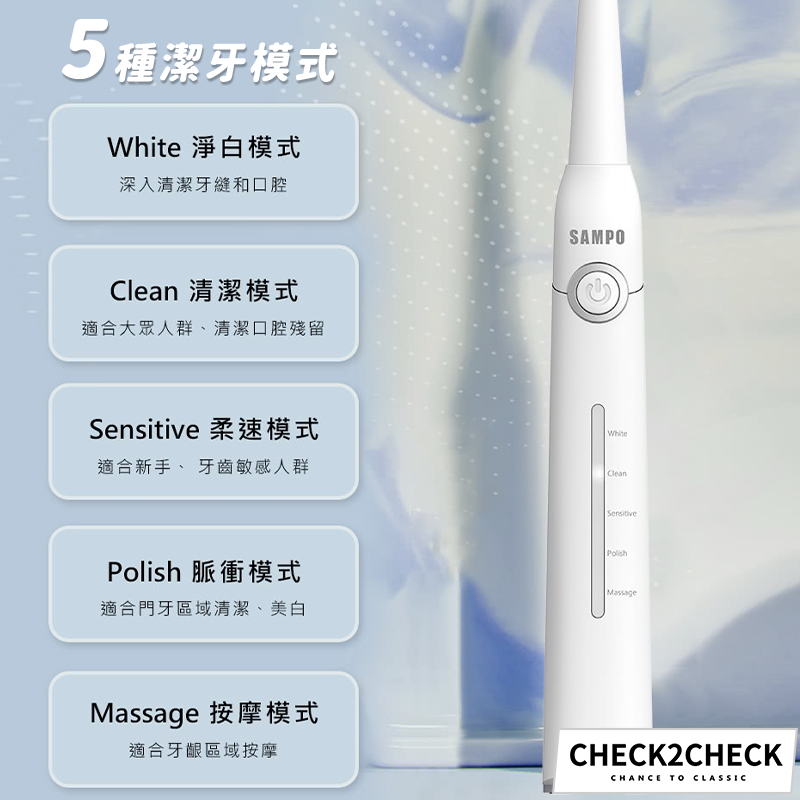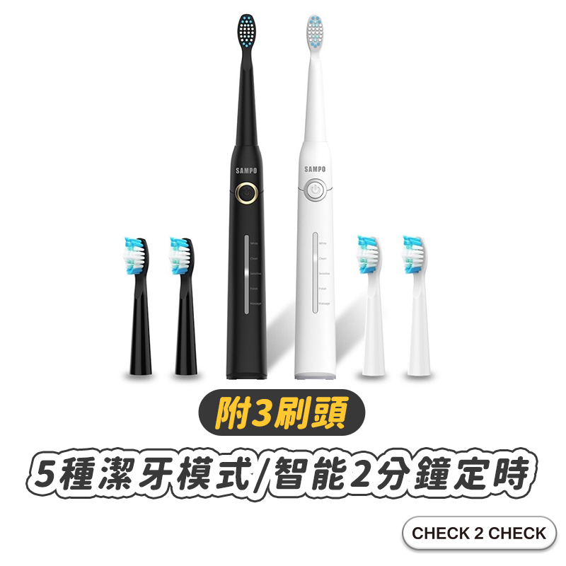 SAMPO-五段式音波震動牙刷(附3刷頭) 黑/白電動牙刷 充電牙刷【CL03-LC21008】[現貨] 禁外島白主機(附3刷頭)|黑主機(附3刷頭)Oral CareCHECK 2 CHECK官方旗艦店