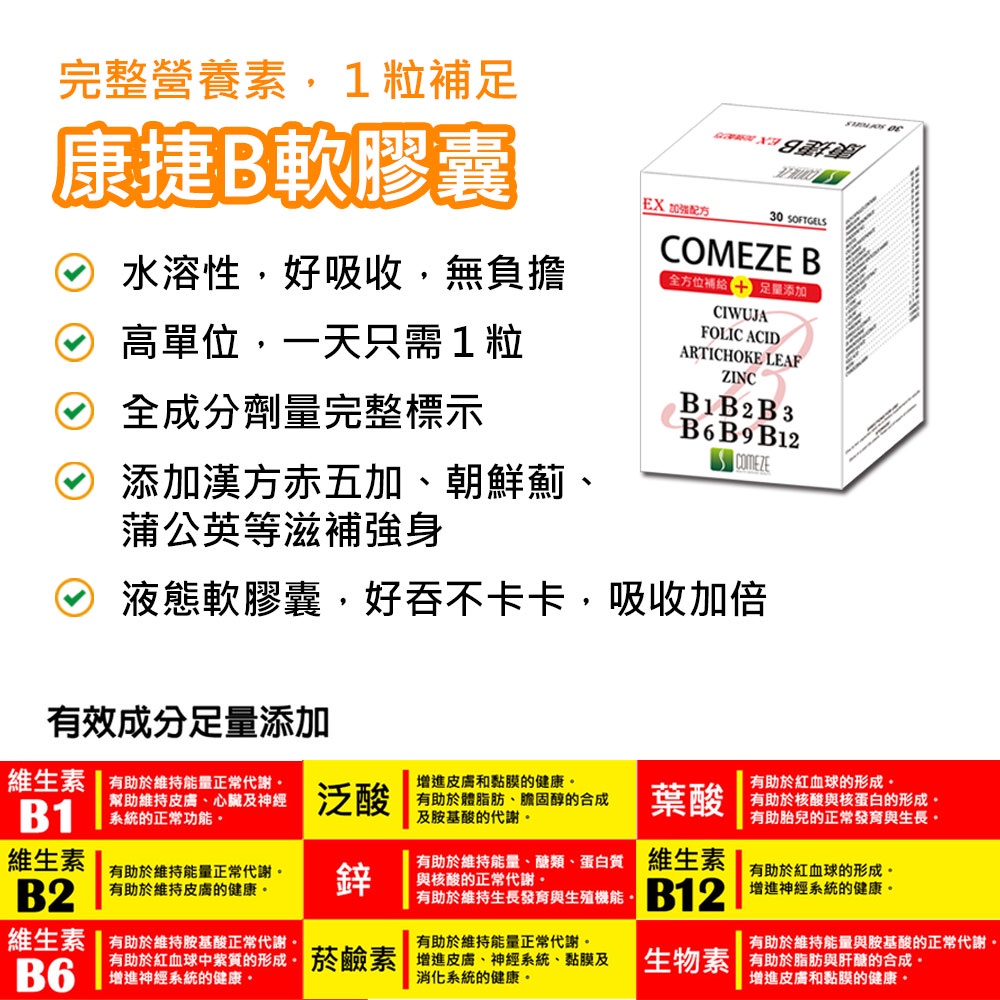 高單位B群 液態軟膠囊(30天份)葉酸 朝鮮薊 鐵 鋅 蒲公英萃取 康捷B B群高單位B群 液態軟膠囊(30天份)葉酸 朝鮮薊 鐵 鋅 蒲公英萃取 康捷B B群Well BeingCOMEZE康澤