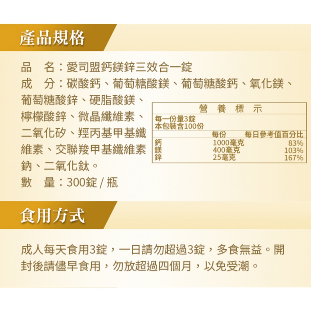 愛司盟鈣鎂鋅三效合一錠 / 300顆量販大包裝 – 2026.05.27愛司盟鈣鎂鋅三效合一錠 / 300顆量販大包裝 – 2026.05.27Well BeingESMOND NATURAL 愛司盟原廠官方旗艦店