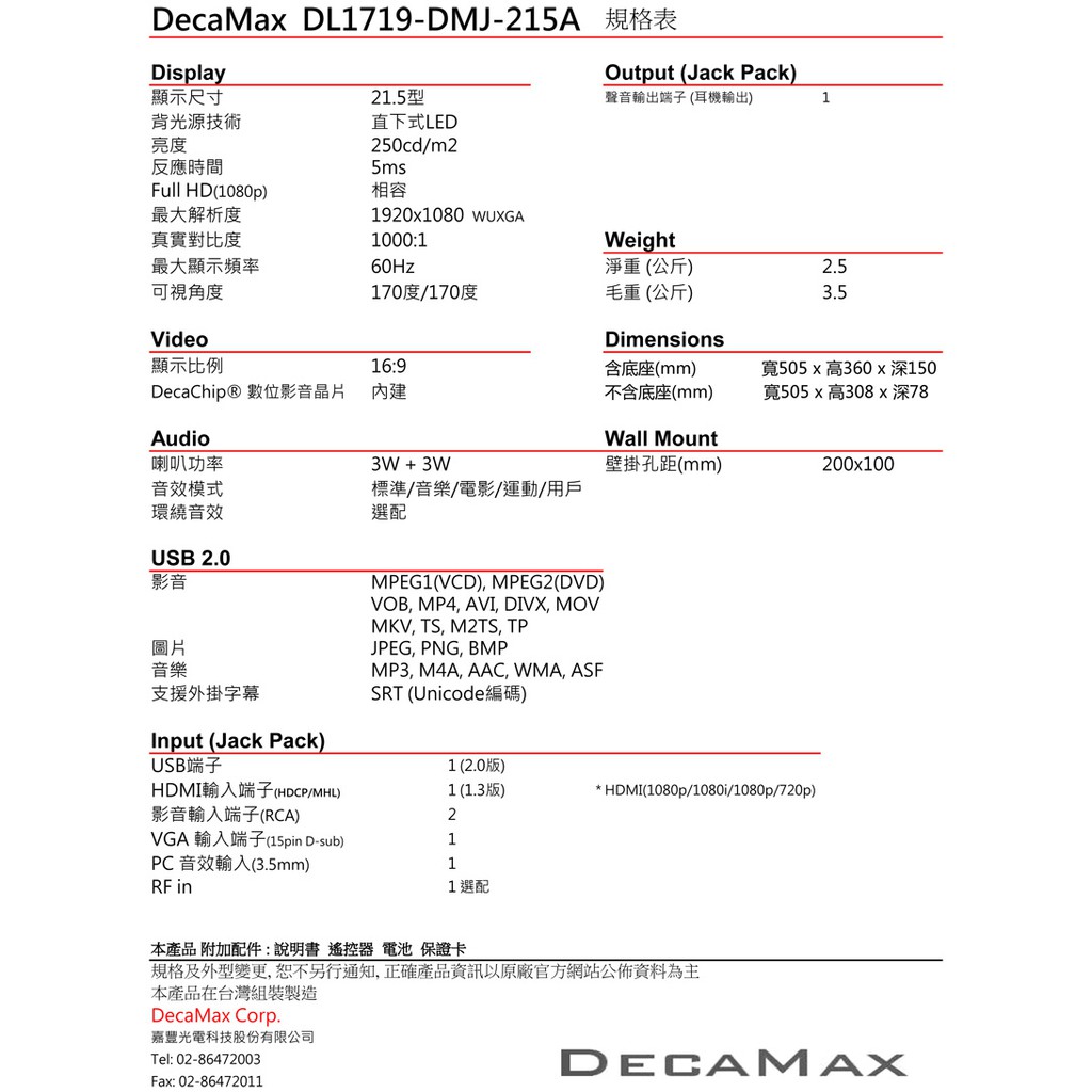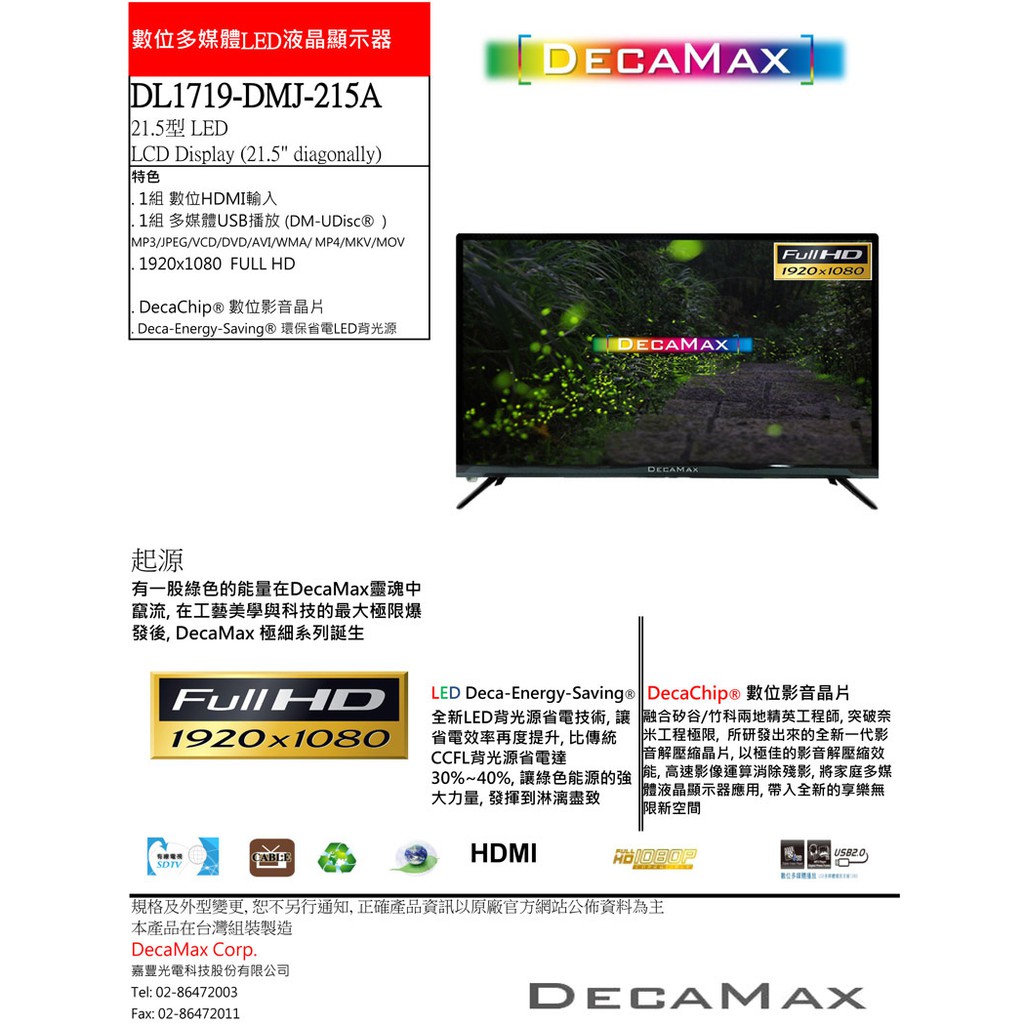 DecaMax 21.5吋 多媒體液晶電視顯示器, 台灣製, 型號 : DL1719-DMJ-215ADecaMax 21.5吋 多媒體液晶電視顯示器, 台灣製, 型號 : DL1719-DMJ-215ATVsDecaMax 網路旗艦店
