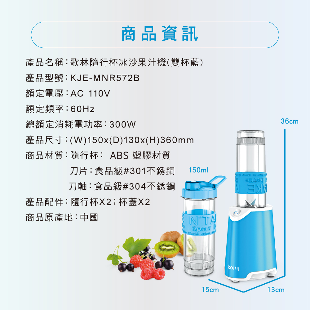 【Kolin】歌林隨行杯冰沙果汁機(雙杯藍)KJE-MNR572B 冰沙機 ABS材質 不含雙酚A【Kolin】歌林隨行杯冰沙果汁機(雙杯藍)KJE-MNR572B 冰沙機 ABS材質 不含雙酚AJuicers, Blenders & Soya Bean MachinesDiscovery Adventures 探索旗艦店