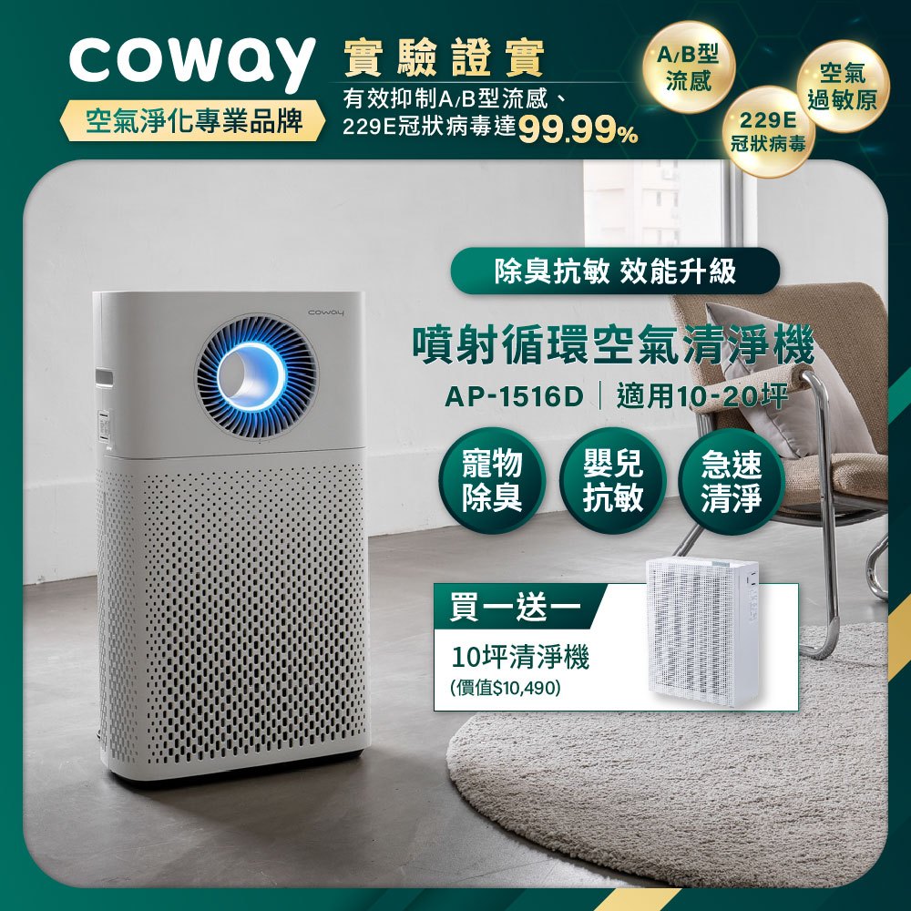 Coway 20+10坪雙機組空氣清淨機 AP 1516 D+AP 1019 C抑制流感 一房一廳熱銷組