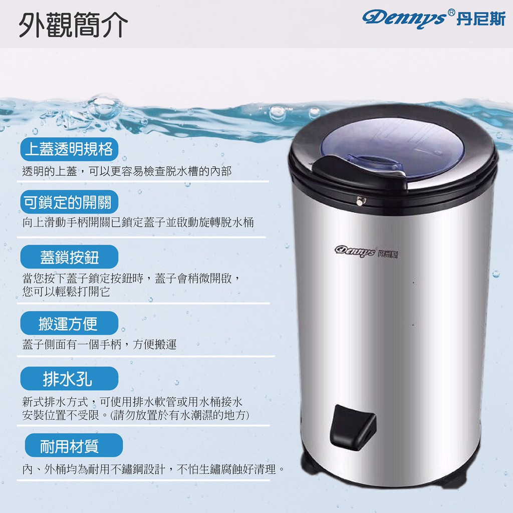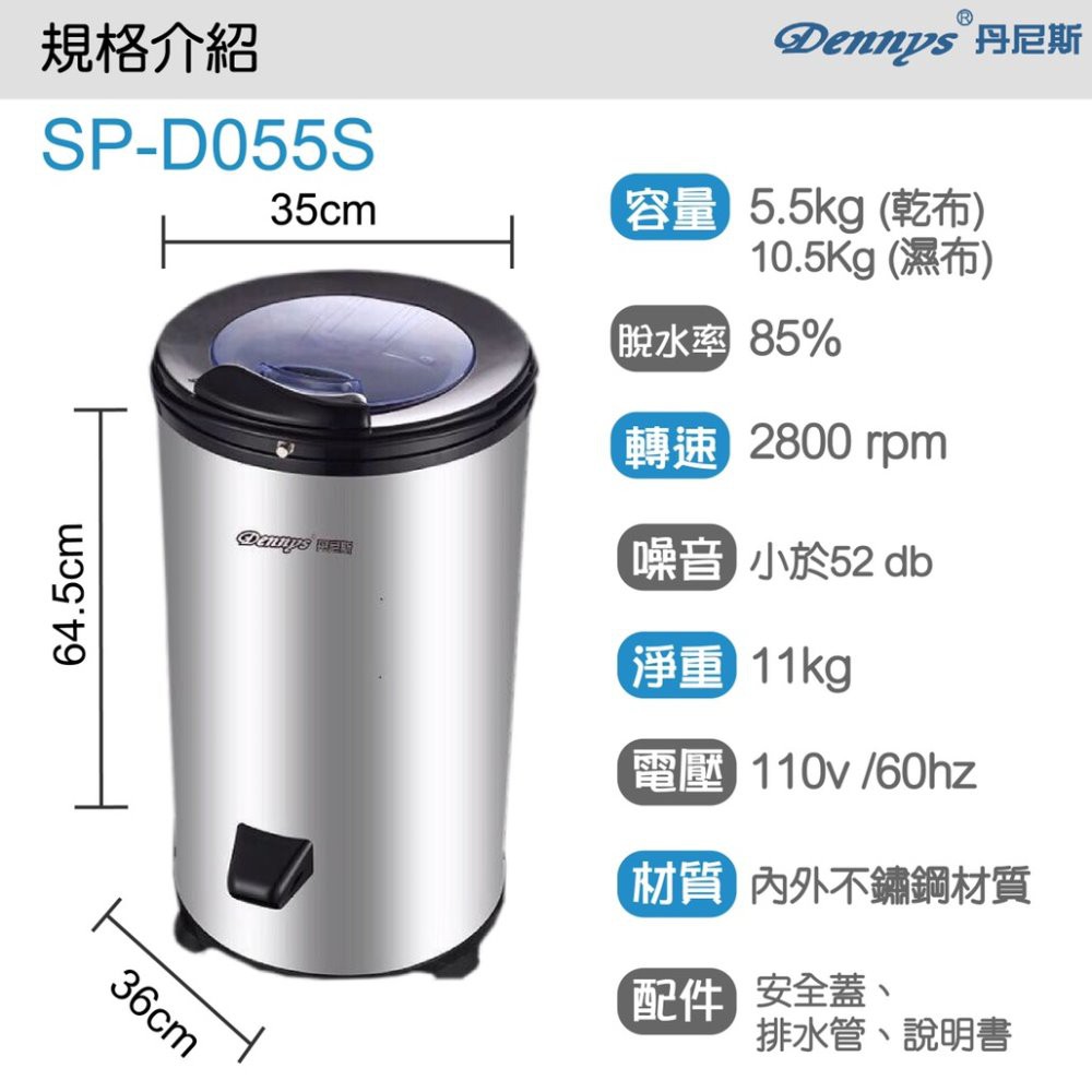Dennys 第二代5.5公斤不鏽鋼多用途高速脫水機 SP-D055SSP-D055S|SP-D055S(離島配送)Washing Machines & DryersDennys丹尼斯旗艦館