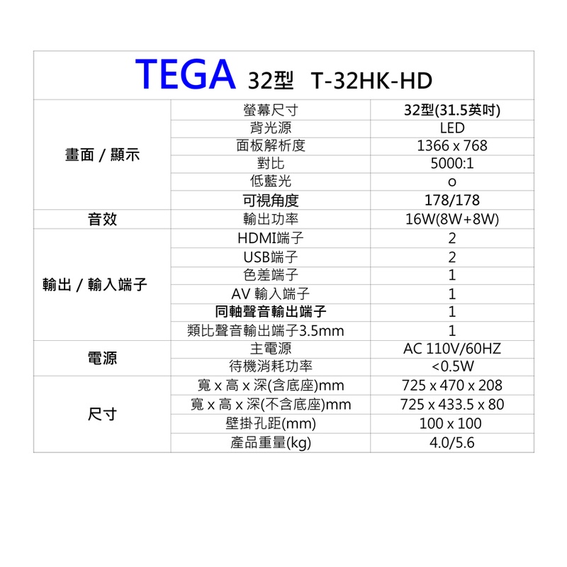 TEGA 32吋 低藍光液晶電視顯示器 T-32HK-HD 全新機32吋基本(無加購)|32吋 + 加購HDMI線|32吋 + 加購壁掛架|32吋 FHD 1920 x 1080TVsDecaMax 網路旗艦店