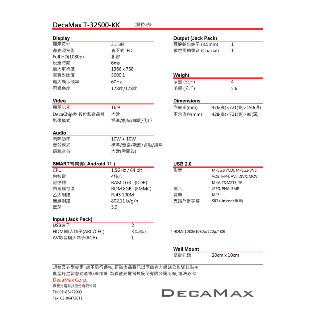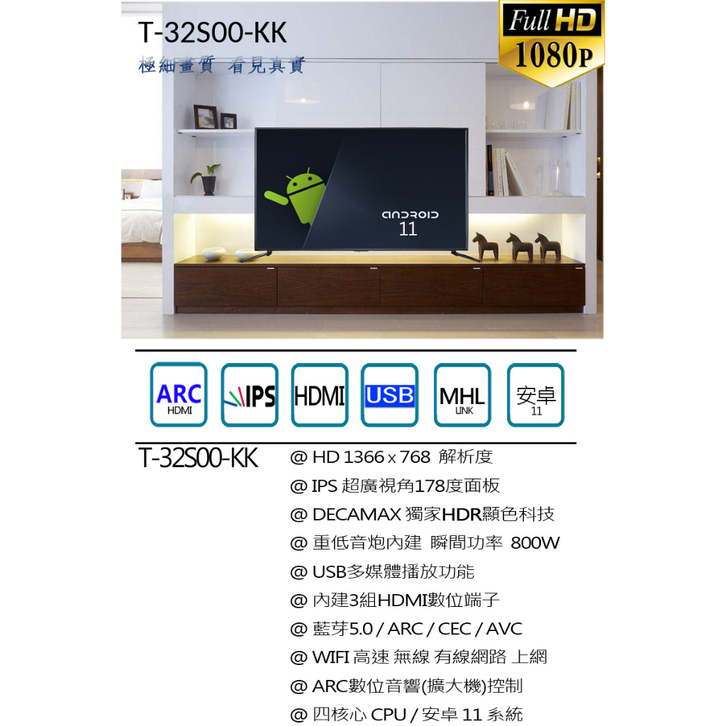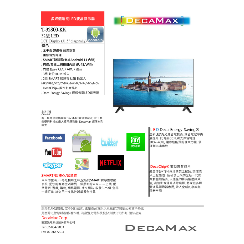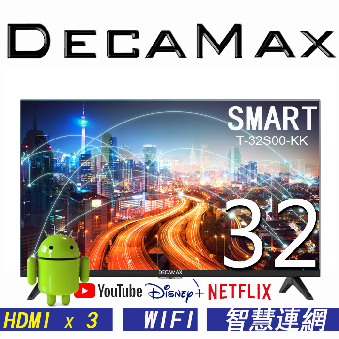 DECAMAX 32吋聯網液晶電視 T-32S00-KK 重低音 安卓11/Youtube/Disney+/Net重低音DECAMAX 32吋聯網液晶電視 T-32S00-KK 重低音 安卓11/Youtube/Disney+/Net重低音TVsDecaMax 網路旗艦店