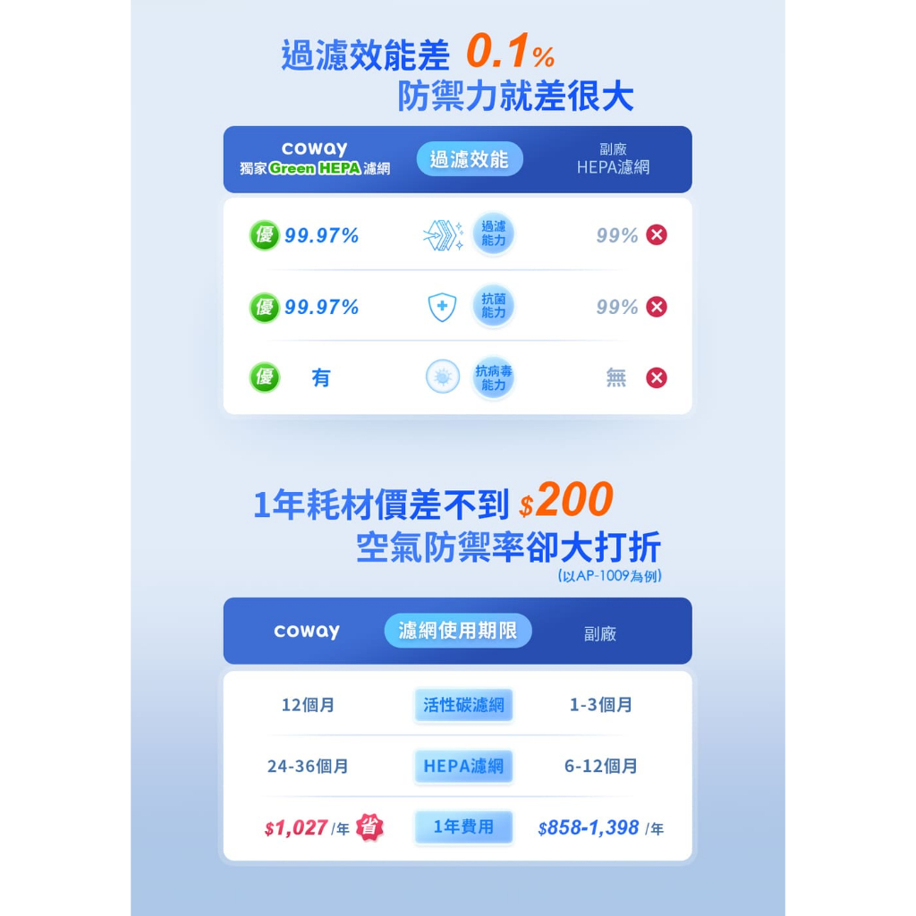 Coway 濾網 原廠耗材 三年份濾網組 適用 AP 1009 CH 空氣清淨機 AP-1009CH 免運 現原廠濾網效能保障Air TreatmentCoway 台灣官方商店