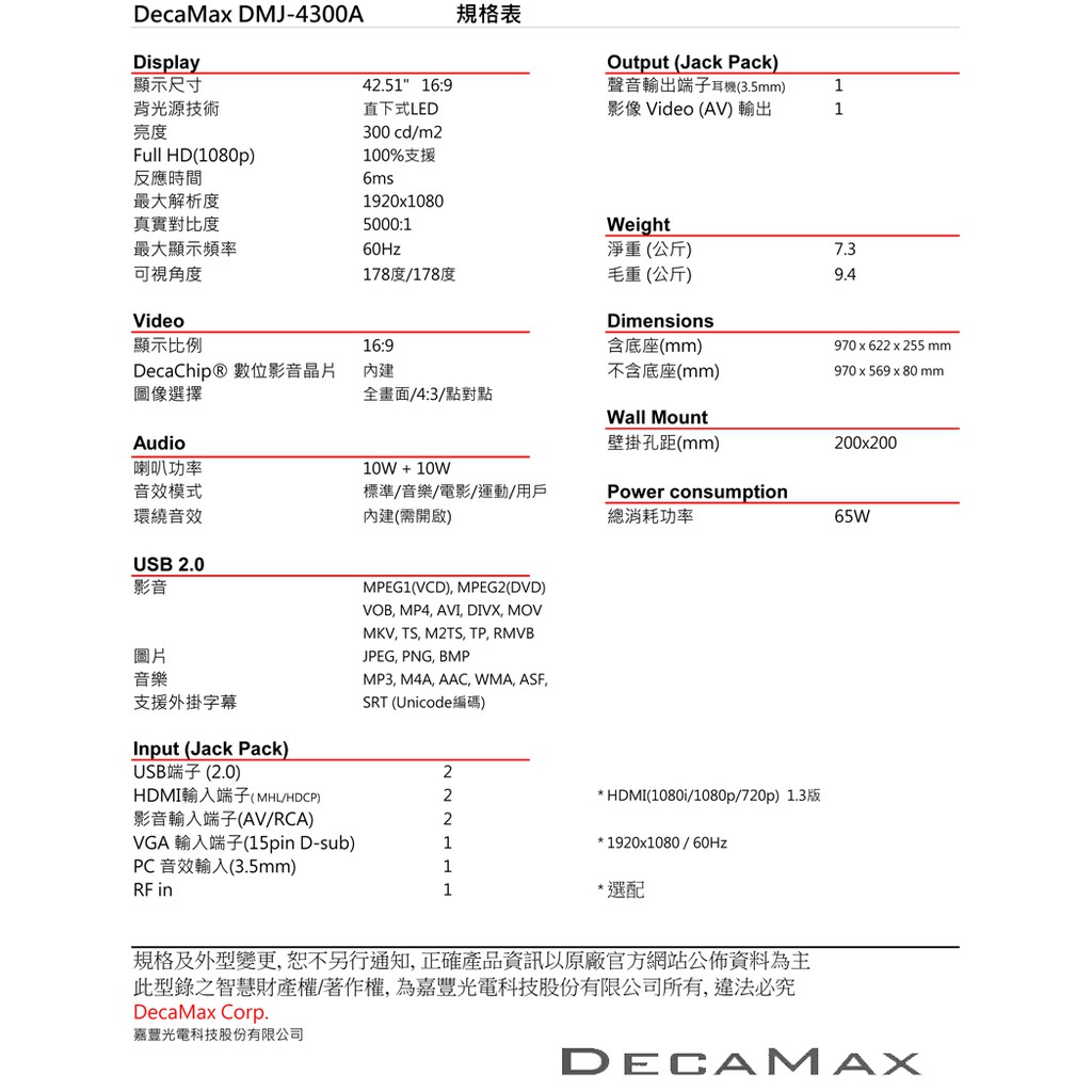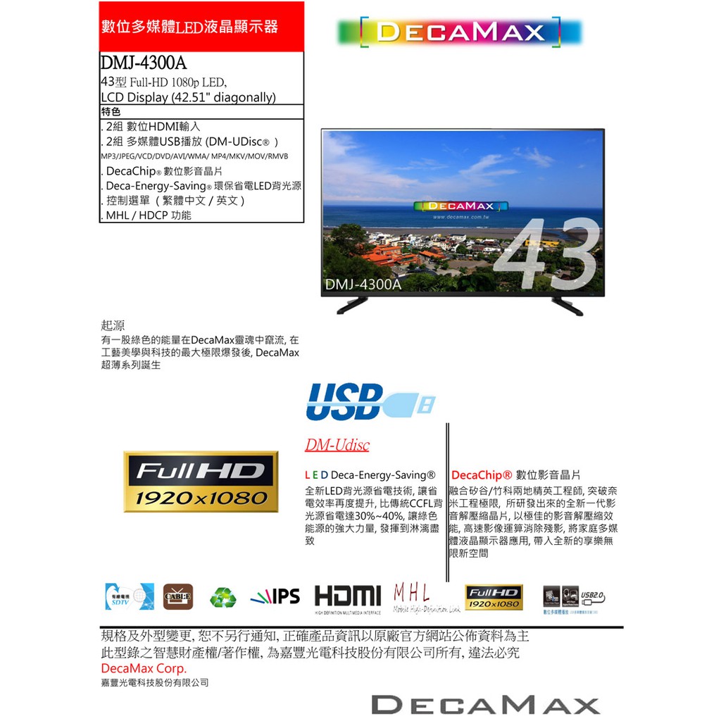 DECAMAX 43吋LED液晶電視 型號 DMJ-4300A LG IPS面板 VGA HDMI USB 1080pDECAMAX 43吋LED液晶電視 型號 DMJ-4300A LG IPS面板 VGA HDMI USB 1080pTVsDecaMax 網路旗艦店