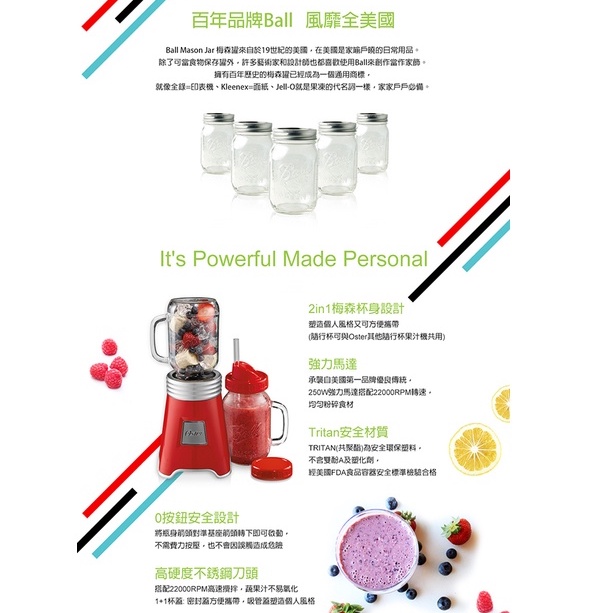 Oster-Ball Mason Jar 奧士達 隨鮮瓶果汁機 杯組【現貨免運】果汁機 隨行杯果汁 梅森杯 冰沙 榨汁機一機二杯特惠組(玫瑰金)|一機二杯特惠組(搖滾紅)|一機二杯特惠組(曜石灰)|一機二杯特惠組(優雅藍)|一機一杯組(優雅藍)|一機一杯組(玫瑰金)|一機一杯組(搖滾紅)|一機一杯組(曜石灰)|梅森杯 替杯(顏色隨機)Juicers, Blenders & Soya Bean Machinesesoon量販3C電玩商城