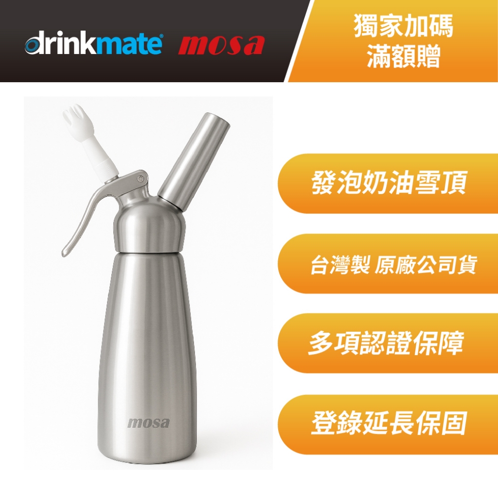 drinkmate / mosa 獨家加碼滿額贈drinkmate 0.5L耐壓水瓶|drinkmate 175g全新氣瓶*2|mosa Soda Splash|drinkmate 425g全新氣瓶|drinkmate 好好拿不鏽鋼瓶蓋|drinkmate 環保隨身提袋|mosa 0.5L圓頭奶油槍-全銀|mosa 0.5L圓頭奶油槍-黑頭|mosa 0.5L圓頭奶油槍-紅瓶Tea, Coffee & Bartending Equipmentsdrinkmate | mosa官方旗艦館