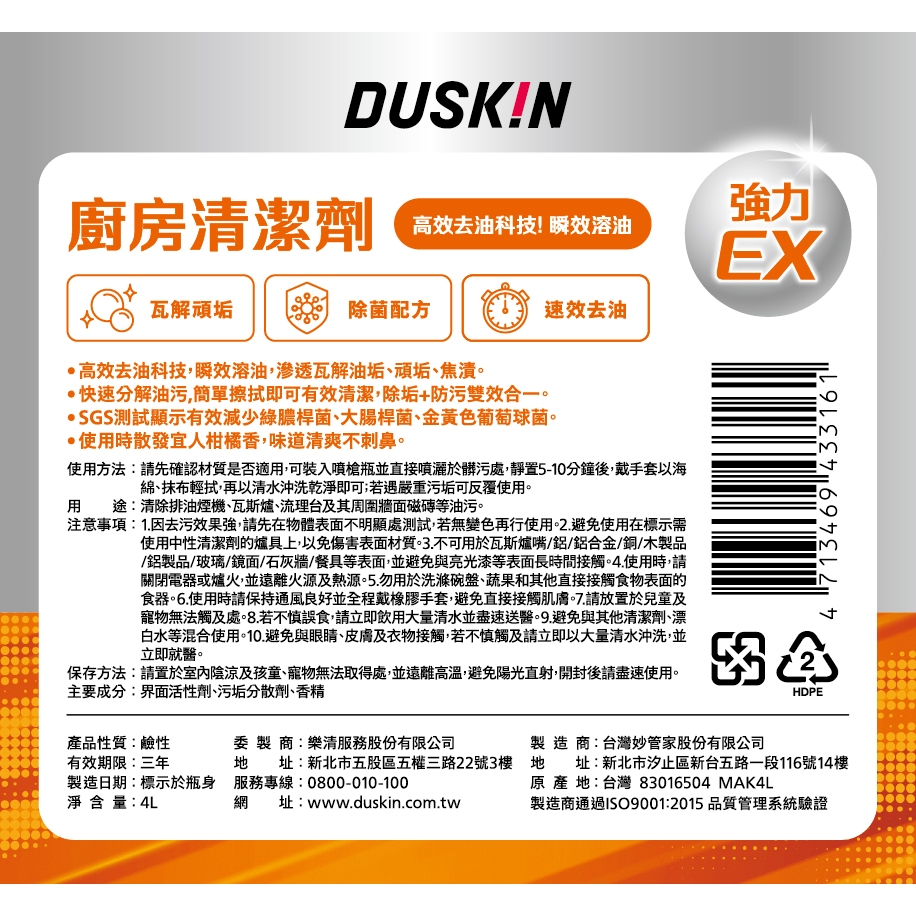 • 【DUSKIN樂清】廚房油污清潔劑(台製)4L