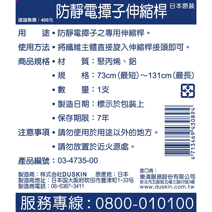 【DUSKIN樂清】防靜電撢子伸縮桿(大紫專用)【DUSKIN樂清】防靜電撢子伸縮桿(大紫專用)DustersDUSKIN 樂清(官方直營)