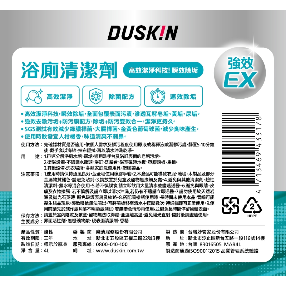 【DUSKIN樂清】浴廁清潔劑(台製)4L【DUSKIN樂清】浴廁清潔劑(台製)4LCleaning AgentsDUSKIN 樂清(官方直營)