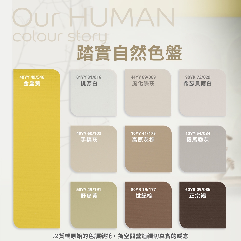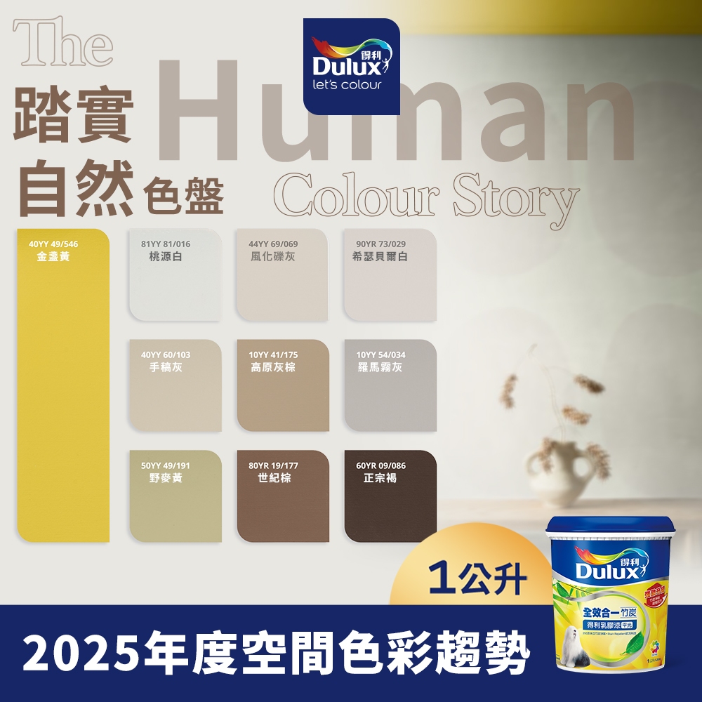 【得利官方旗艦店】A986 全效合一竹炭乳膠漆 2025年度精選色系-踏實自然色盤 電腦調色(1公升裝)|客製化調色漆10YY 54/034(客製色無退換)|81YY 81/016(客製色無退換)|50YY 49/191(客製色無退換)|44YY 69/069(客製色無退換)|80YR 19/177(客製色無退換)|60YR 09/086(客製色無退換)|40YY 49/546(客製色無退換)|40YY 60/103(客製色無退換)|10YY 41/175(客製色無退換)|90YR 73/029(客製色無退換)Wall Paints & CoatingsDulux得利塗料官方旗艦店