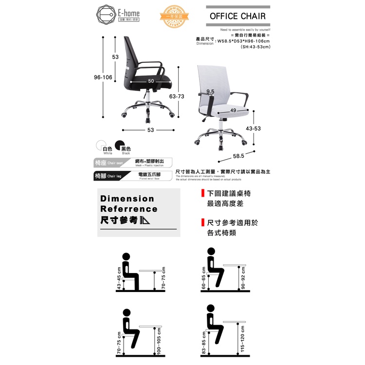 E-home 布立歐扶手半網可調式電腦椅 辦公椅 椅子 書桌椅 人體工學 美容椅黑色|白色Benches, Chairs & StoolsE-home 美規設計傢俱