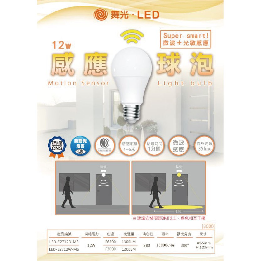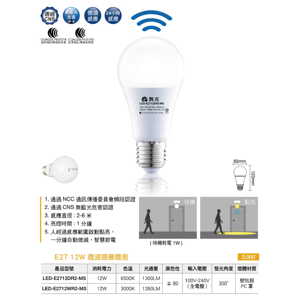 【舞光.LED】 LED E27/12W微波感應球泡燈泡(黃光/白光)【實體門市保固兩年】-E2712D/WR2-MS3000K 黃光|6500K 白光DREAM LIGHTS 築光燈飾