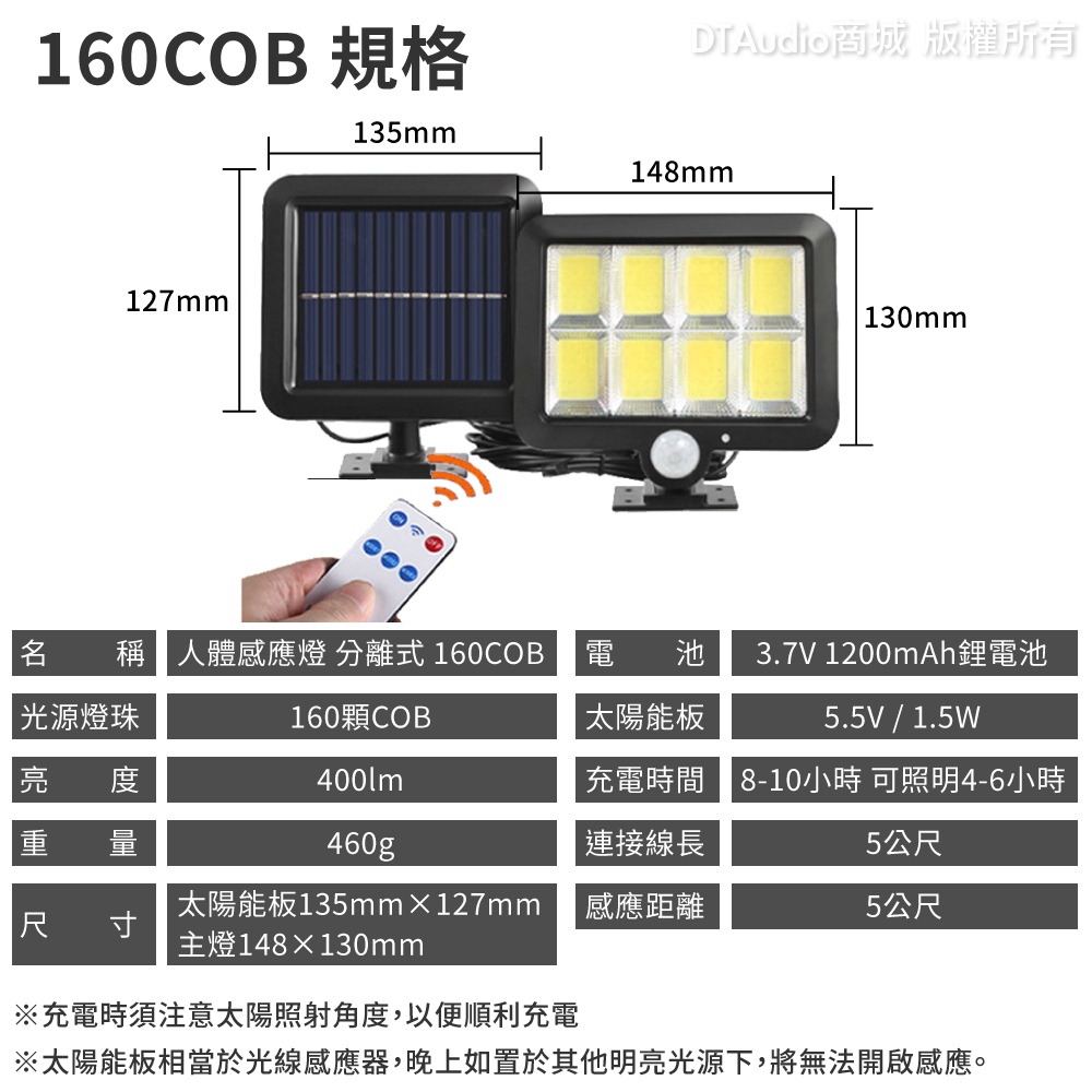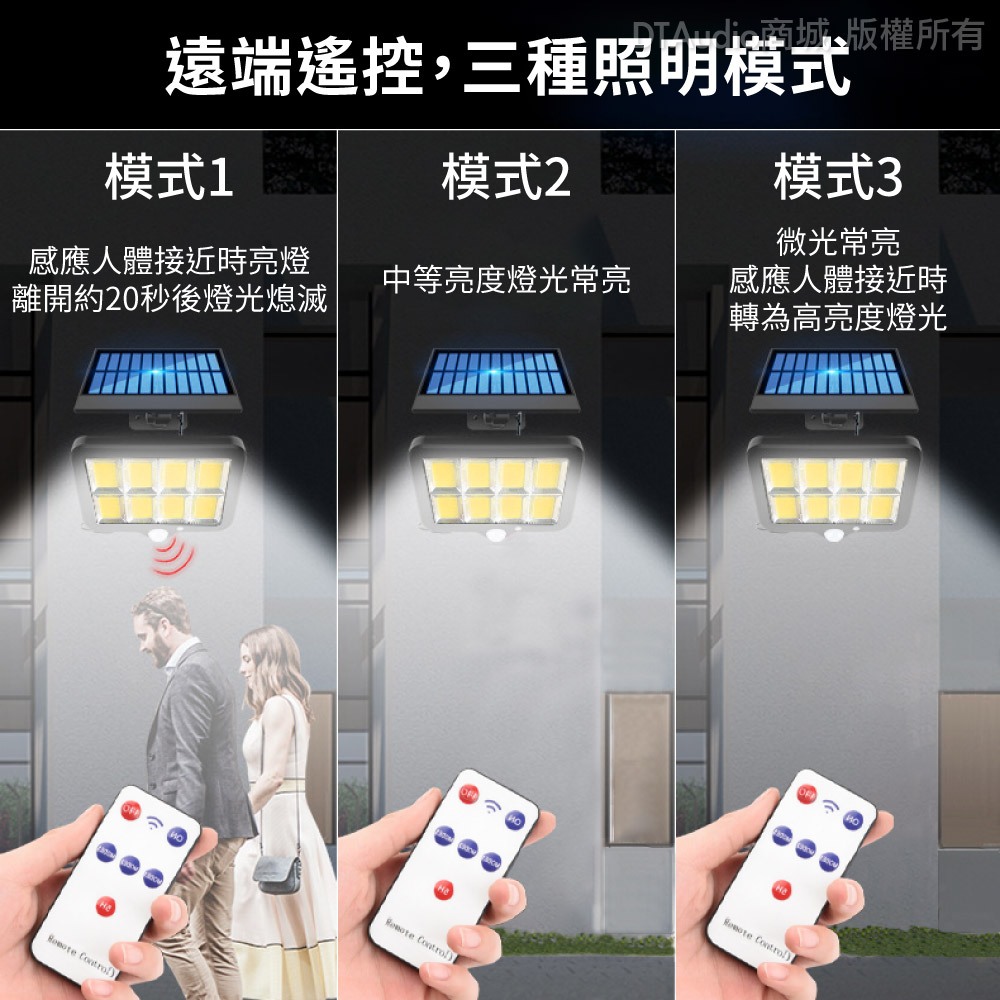 人體感應燈 分離式 160/288COB 太陽能 0電費 LED 遙控 紅外線 自動照明 三種照明模式 戶外 聆翔旗艦店人體感應燈分離式 160COB|人體感應燈分離式 288COBDTAudio 聆翔官方旗艦店-你的耳機喇叭專門家