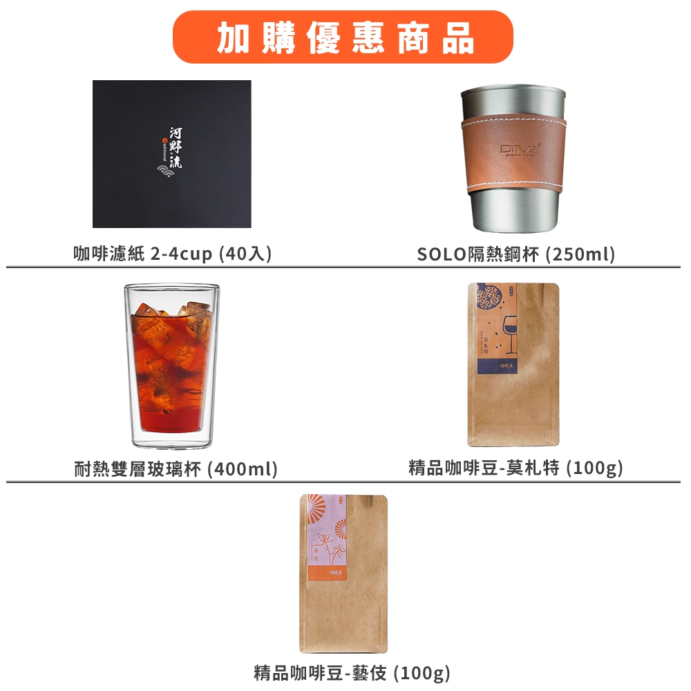 Driver 新手入門手沖咖啡套裝組-3 手沖壺 細口壺 咖啡濾杯 不鏽鋼濾杯 耐熱玻璃壺 溫度計 手沖咖啡組 官方直營新手入門手沖咖啡套裝組-3,耐熱雙層玻璃杯 (400ml)|新手入門手沖咖啡套裝組-3,無需加購|新手入門手沖咖啡套裝組-3,咖啡錐形濾紙 2-4cup (40入)|新手入門手沖咖啡套裝組-3,SOLO隔熱鋼杯 (250ml)|新手入門手沖咖啡套裝組-3,精品咖啡豆-莫札特 (100g)|新手入門手沖咖啡套裝組-3,精品咖啡豆-藝伎 (100g)Tea, Coffee & Bartending EquipmentsDriver 官方旗艦店|村宜企業