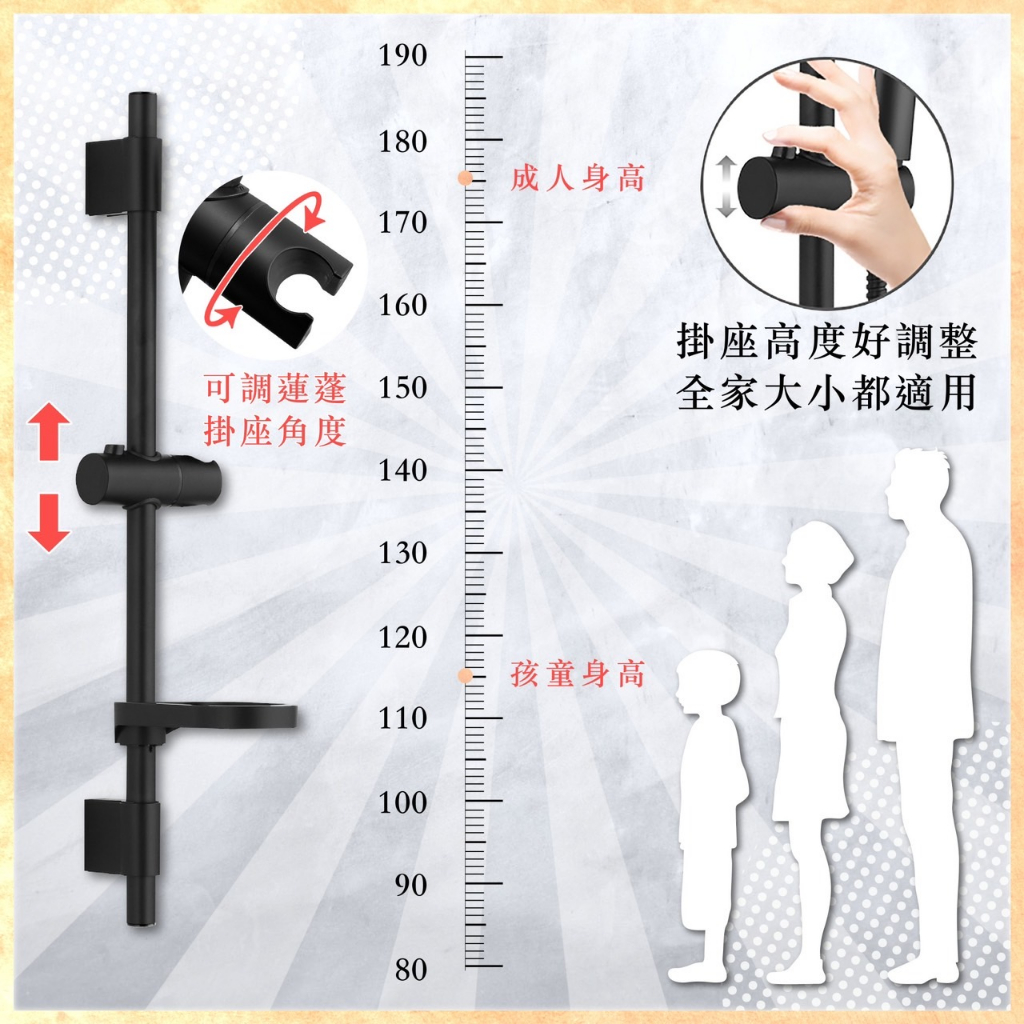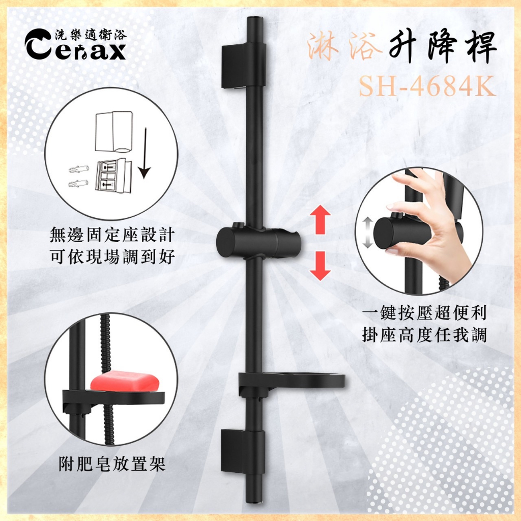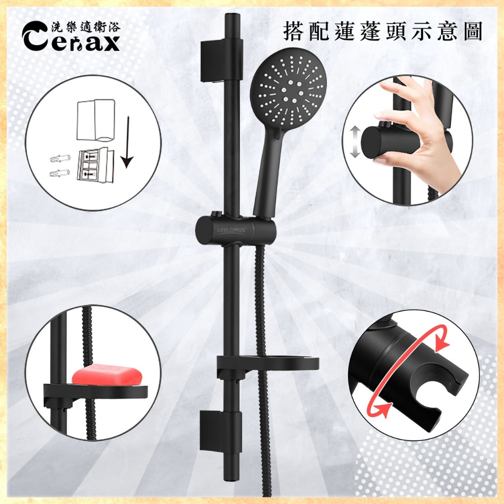【CERAX洗樂適】黑色滑桿、升降沐浴蓮蓬頭滑桿+肥皂盤、掛座、可調高度【CERAX洗樂適】黑色滑桿、升降沐浴蓮蓬頭滑桿+肥皂盤、掛座、可調高度Showerheads & Bidet SpraysCERAX洗樂適衛浴 I馬桶|免治|浴櫃|龍頭|鏡子|置衣架|配件|換氣設備|