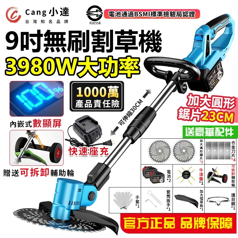 【Cang小達】9吋無刷割草機 割草機 送牛津繩 3980W大功率充電式割草機 帶電量顯示 認證BSMI:R3E558無刷至尊款【無電池座充】送大禮包|無刷至尊款【電瓶款】送大禮包+背包|背負式電瓶【66000毫安】3H超長續航|無刷至尊款【10000M】兩電送大禮包|無刷至尊款【10000M】一電送大禮包|無刷至尊款【20000M】一電送大禮包|無刷至尊款【20000M】兩電送大禮包|無刷至尊款【25000M】一電送大禮包|無刷至尊款【25000M】兩電送大禮包Lawn MowersCang小達丨品牌旗艦店