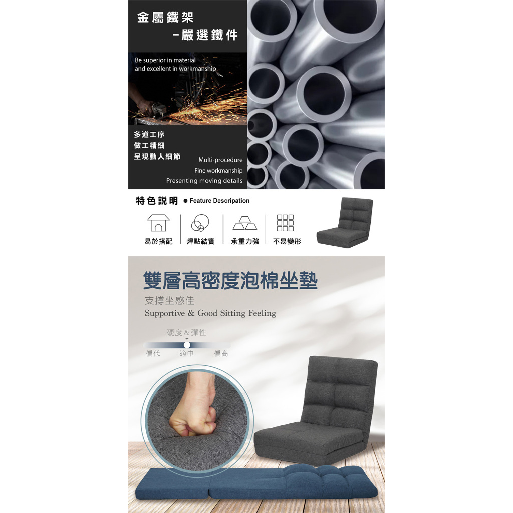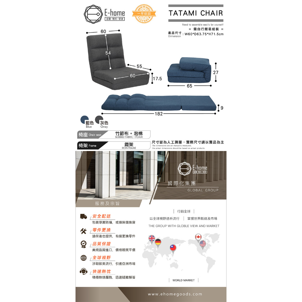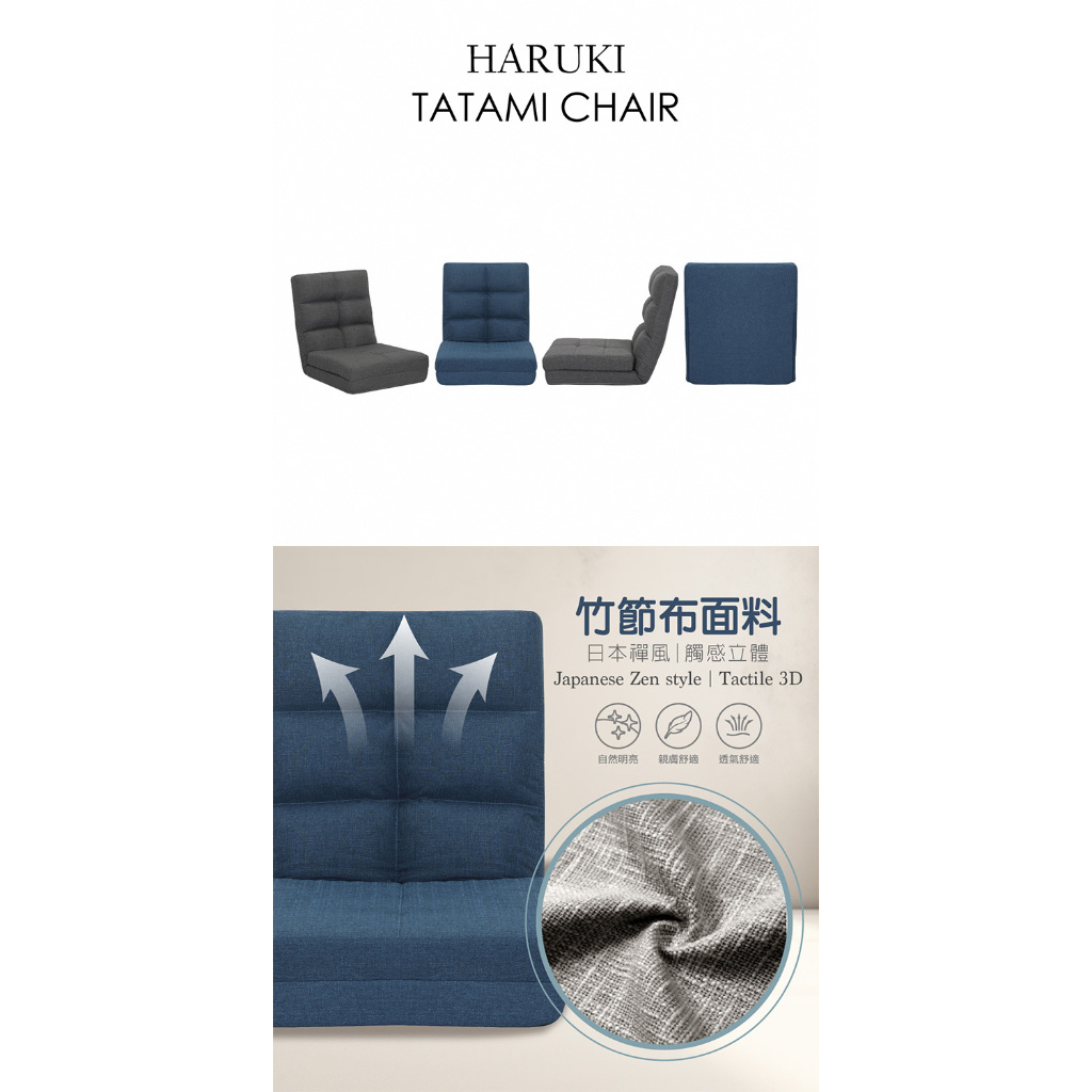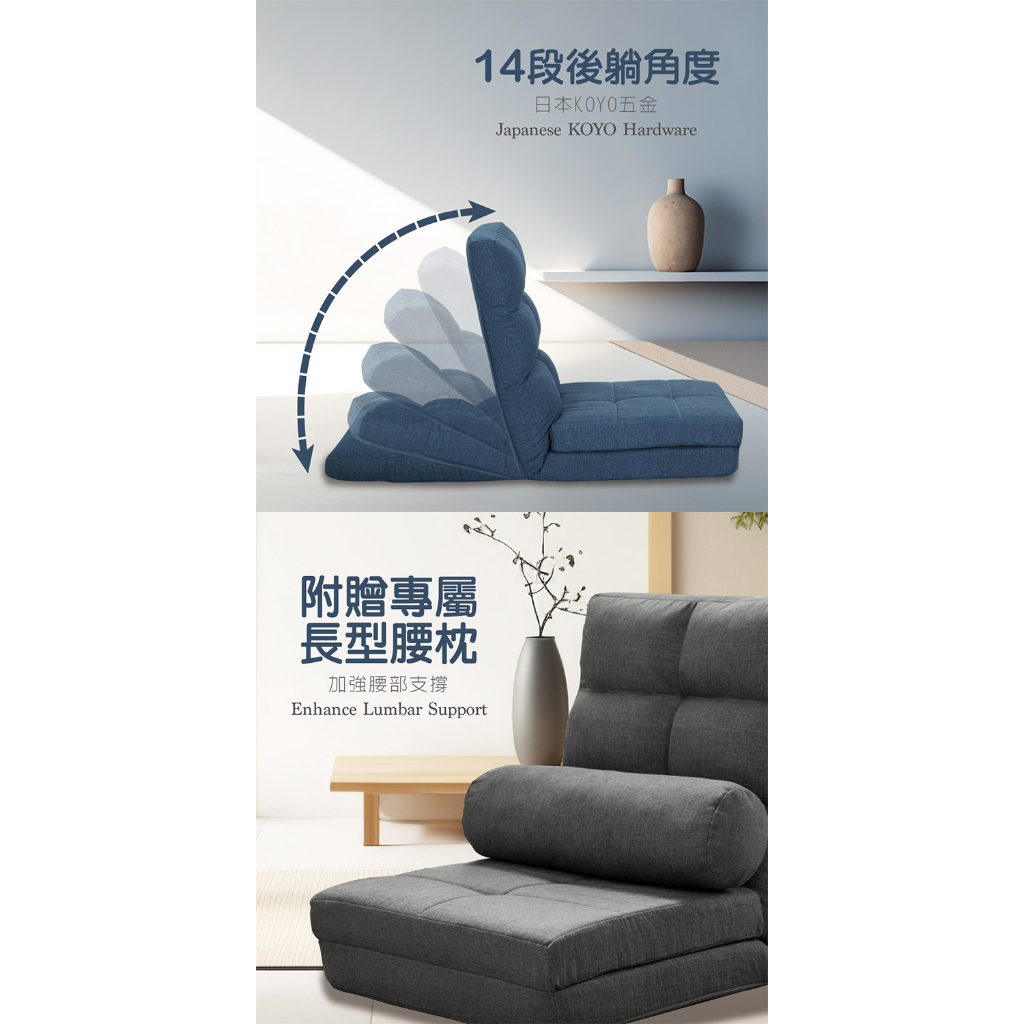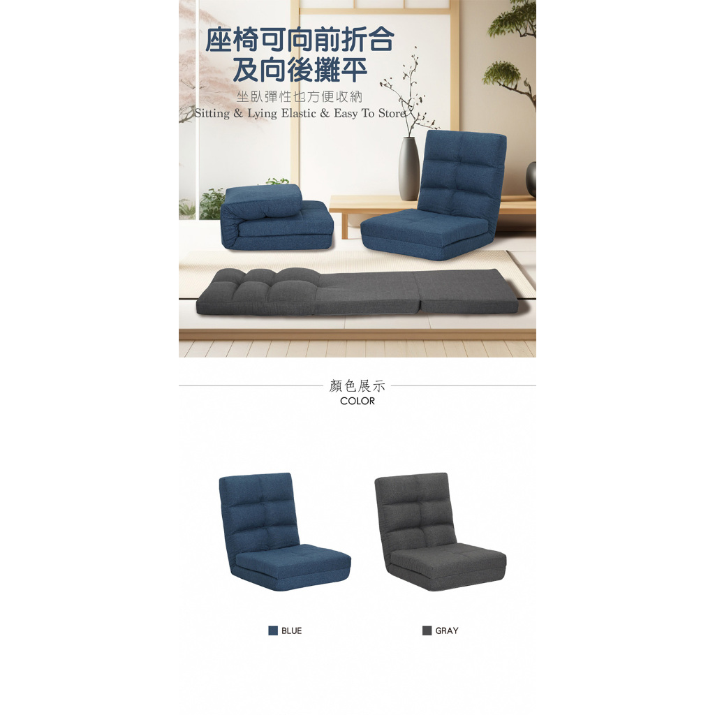 E-home 春樹日規布面椅背14段翻折腳墊附抱枕和室椅 椅子靠背 懶人沙發 折疊椅 躺椅灰色|藍色Benches, Chairs & StoolsE-home 美規設計傢俱