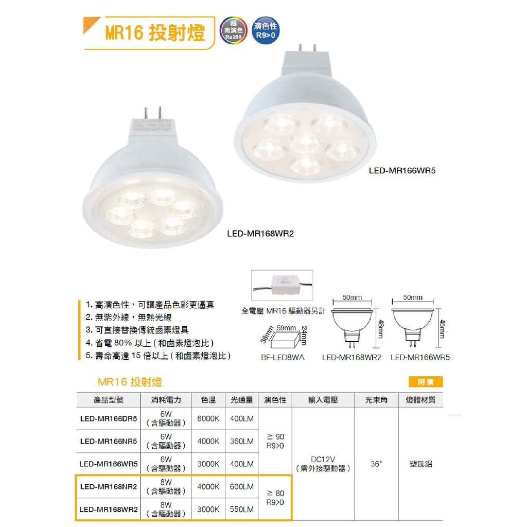 【舞光.LED】LED MR16/8W/12V外接驅動投射燈(黃光/自然光)【實體門市保固兩年】-MR168W含驅動,3000K 黃光|含驅動,4000K 自然光|不含驅動,3000K 黃光|不含驅動,4000K 自然光DREAM LIGHTS 築光燈飾