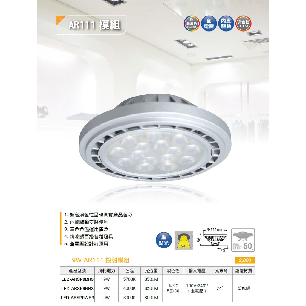 【舞光.LED】AR111/9W投射型模組燈泡(黃光/自然光/白光)【實體門市保固兩年】-ARSP9W5700K 白光|4000K 自然光|3000K 黃光DREAM LIGHTS 築光燈飾
