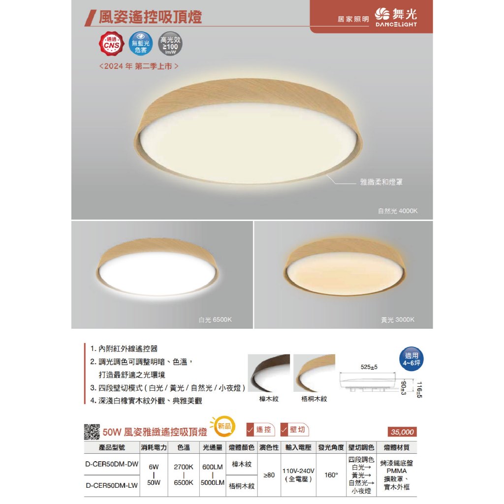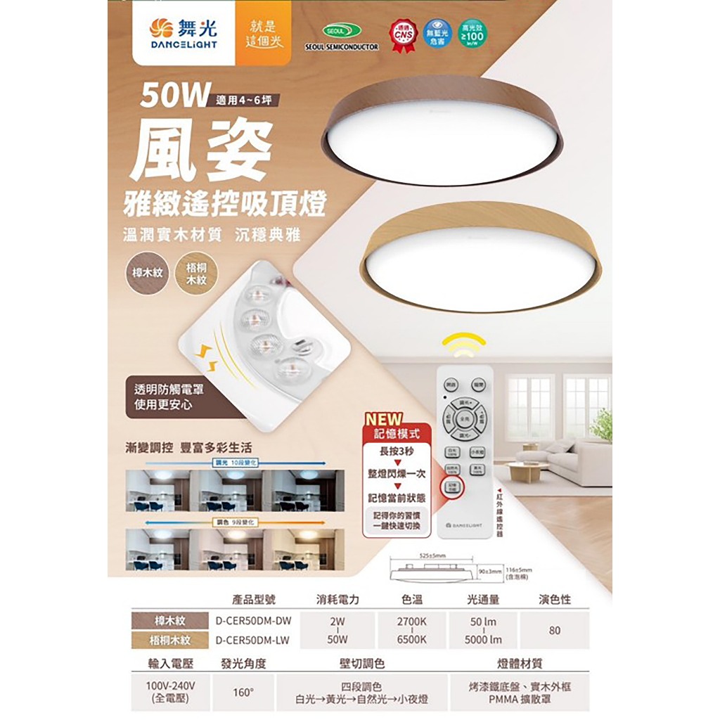 【舞光.LED】LED 50W風姿實木調光搖控吸頂燈【實體門市保固二年】CER50DM 客廳燈 臥室燈 吸頂燈 實木燈梧桐木紋|樟木紋DREAM LIGHTS 築光燈飾