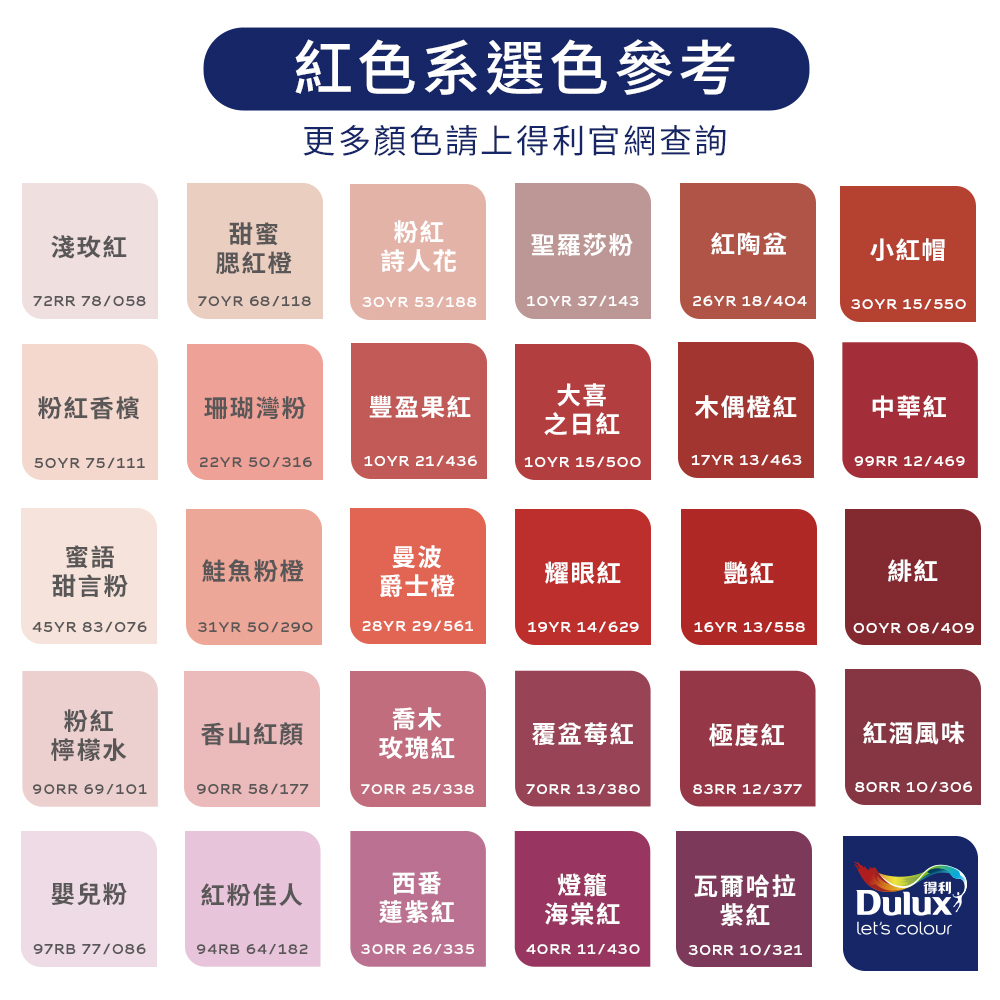 【得利官方旗艦店】A991 竹炭健康居除甲醛乳膠漆 精選紅色系 電腦調色(1公升裝)|客製化調色漆83RR 12/377(客製色無退換)|99RR 12/469(客製色無退換)|80RR 10/306(客製色無退換)|40RR 11/430(客製色無退換)|30RR 10/321(客製色無退換)|19YR 14/629(客製色無退換)|10YR 15/500(客製色無退換)|28YR 29/561(客製色無退換)|94RB 64/182(客製色無退換)|30YR 15/550(客製色無退換)|50YR 75/111(客製色無退換)|10YR 21/436(客製色無退換)|45YR 83/076(客製色無退換)|16YR 13/558(客製色無退換)|70RR 13/380(客製色無退換)|72RR 78/058(客製色無退換)|22YR 50/316(客製色無退換)|90RR 69/101(客製色無退換)|97RB 77/086(客製色無退換)|30YR 53/188(客製色無退換)|30RR 26/335(客製色無退換)|90RR 58/177(客製色無退換)|10YR 37/143(客製色無退換)|26YR 18/404(客製色無退換)|00YR 08/409(客製色無退換)|70RR 25/338(客製色無退換)|70YR 68/118(客製色無退換)|31YR 50/290(客製色無退換)|17YR 13/463(客製色無退換)Wall Paints & CoatingsDulux得利塗料官方旗艦店