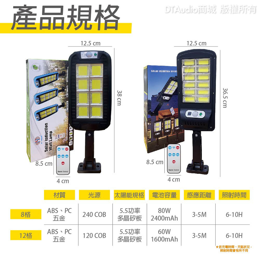 太陽能感應式路燈 0電費 遙控3種模式 白天充電晚上亮燈 LED燈 太陽能 人體感應 感應燈 太陽能 戶外燈 聆翔旗艦店12格-120COB|8格-240COBDTAudio 聆翔官方旗艦店-你的耳機喇叭專門家
