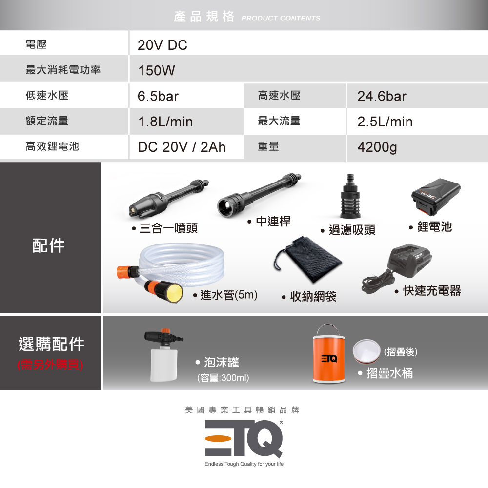 【ETQ USA】20V快充鋰電清洗機/免牽線/自吸功能/領券再享折扣優惠|ETQ旗艦店【ETQ USA】20V快充鋰電清洗機/免牽線/自吸功能/領券再享折扣優惠|ETQ旗艦店ToolsETQ USA 美國專業工具暢銷品牌