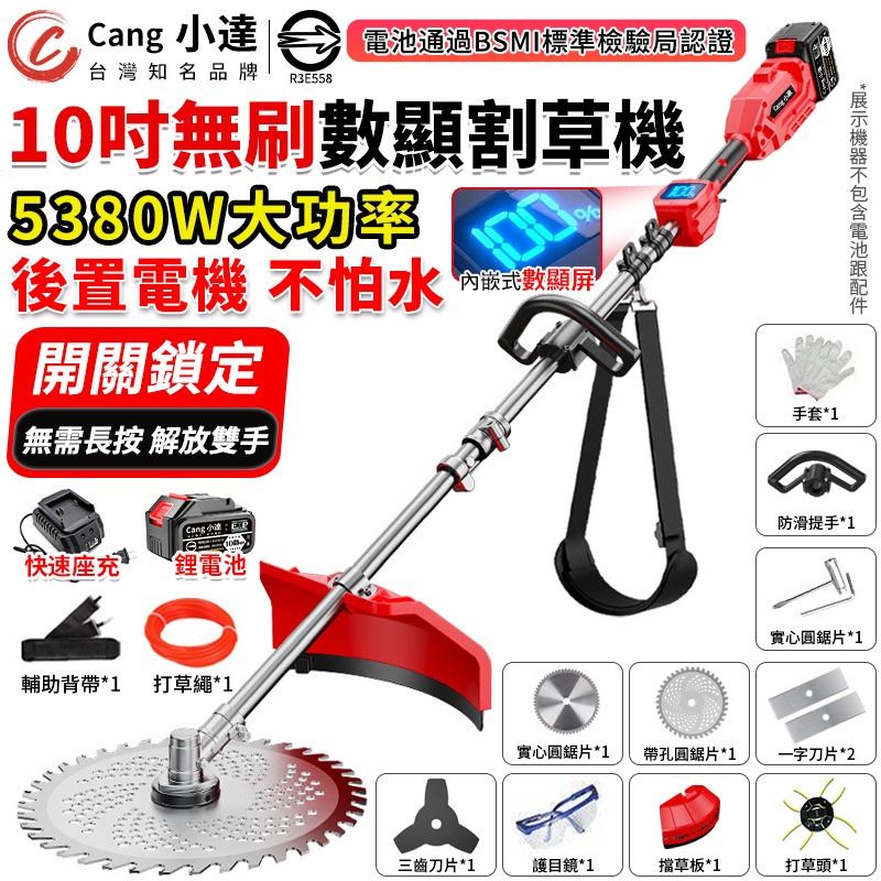 【Cang小達】割草機 10吋無刷割草機 後置電機 帶電量顯示 5380W大功率除草機打草機 BSMI認證:R3E558後置無刷數顯款【無電池無座充】送大禮包|後置無刷數顯款【十節一電】送大禮包|後置無刷數顯款【十節兩電】送大禮包|後置無刷數顯款【十五節一電】送大禮包|後置無刷數顯款【十五節兩電】送大禮包|後置無刷數顯款【電瓶+背包】送大禮包|背負式電瓶【66000毫安】3H超長續航Lawn MowersCang小達丨品牌旗艦店