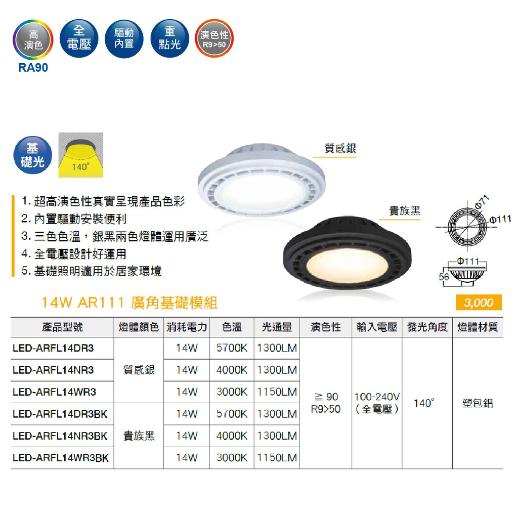 【舞光.LED】AR111/14W廣角基礎散光型燈泡模組(黃光/自然光/白光)(銀/黑)【實體門市保固兩年】-ARB14