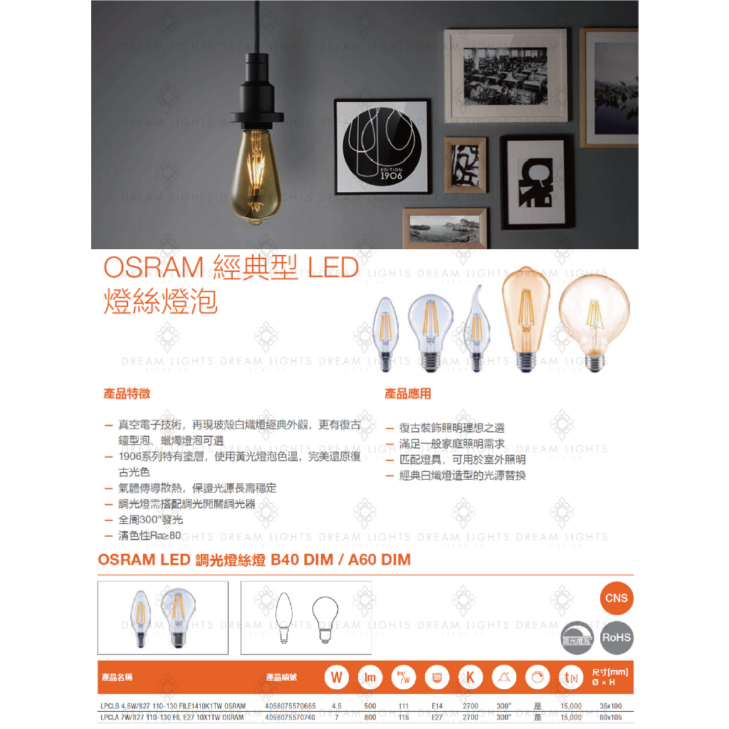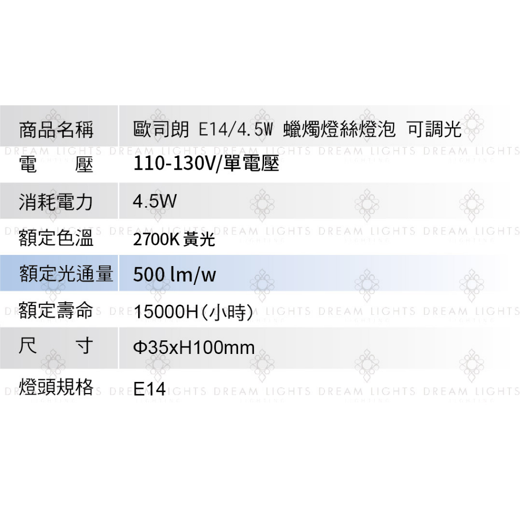 【歐司朗 OSRAM】LED E14/4.5W可調光燈絲燈泡/尖清(黃光)【實體門市保固一年】LED調光燈泡水晶燈泡【歐司朗 OSRAM】LED E14/4.5W可調光燈絲燈泡/尖清(黃光)【實體門市保固一年】LED調光燈泡水晶燈泡DREAM LIGHTS 築光燈飾