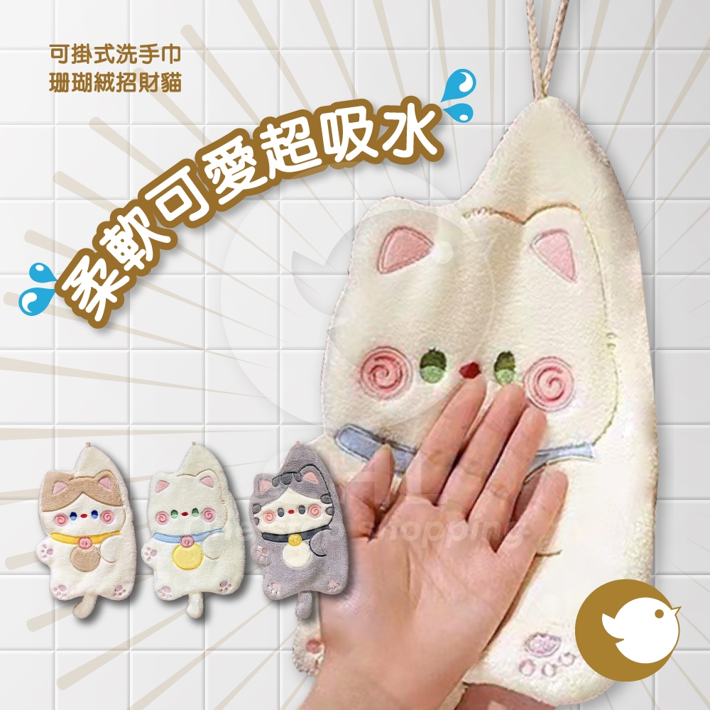 【CHL】珊瑚絨招財貓 可掛式洗手巾 柔軟 可愛 超吸水 速乾 擦手巾 貓咪造型 不掉毛 廚房 衛浴 懸掛設計 居家好物