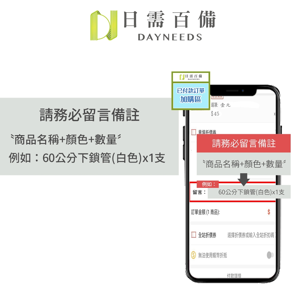 當天已付款訂單加購商品區 加買商品 已結帳未出貨訂單 務必先聊聊確認再下單 (加買商品只限與當天付款訂單合併出貨)如10元商品就選擇數量10|請於備註寫下你要加買的商品(名稱+顏色+|請務必聊聊確認之後再下單此賣場Othersdayneeds收納生活館