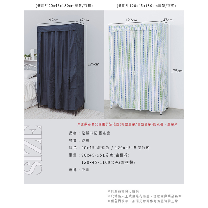 dayneeds 拉簾式防塵布套適用90×45/120×45 適用於180cm高衣櫥架 布套高度17590x45x180鐵架適用(深藍色)|120x45x180鐵架適用(白底竹節)Furniture & Appliance Coversdayneeds收納生活館