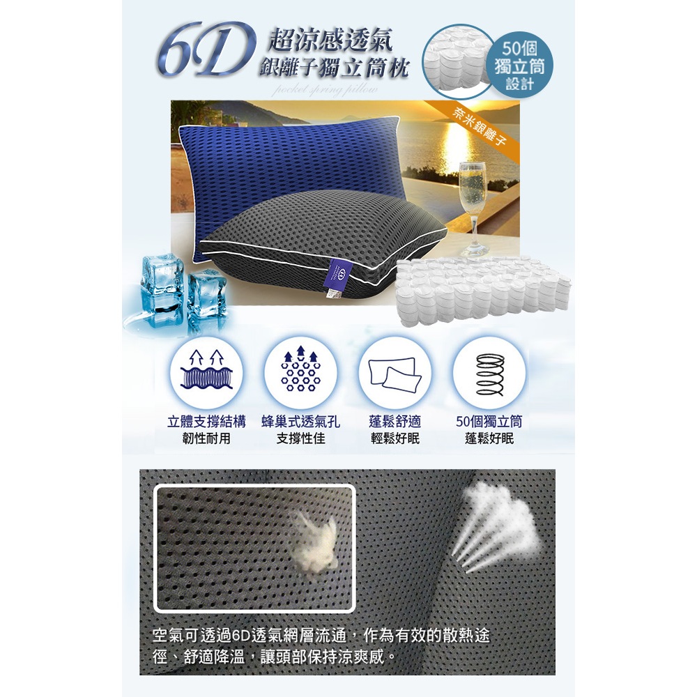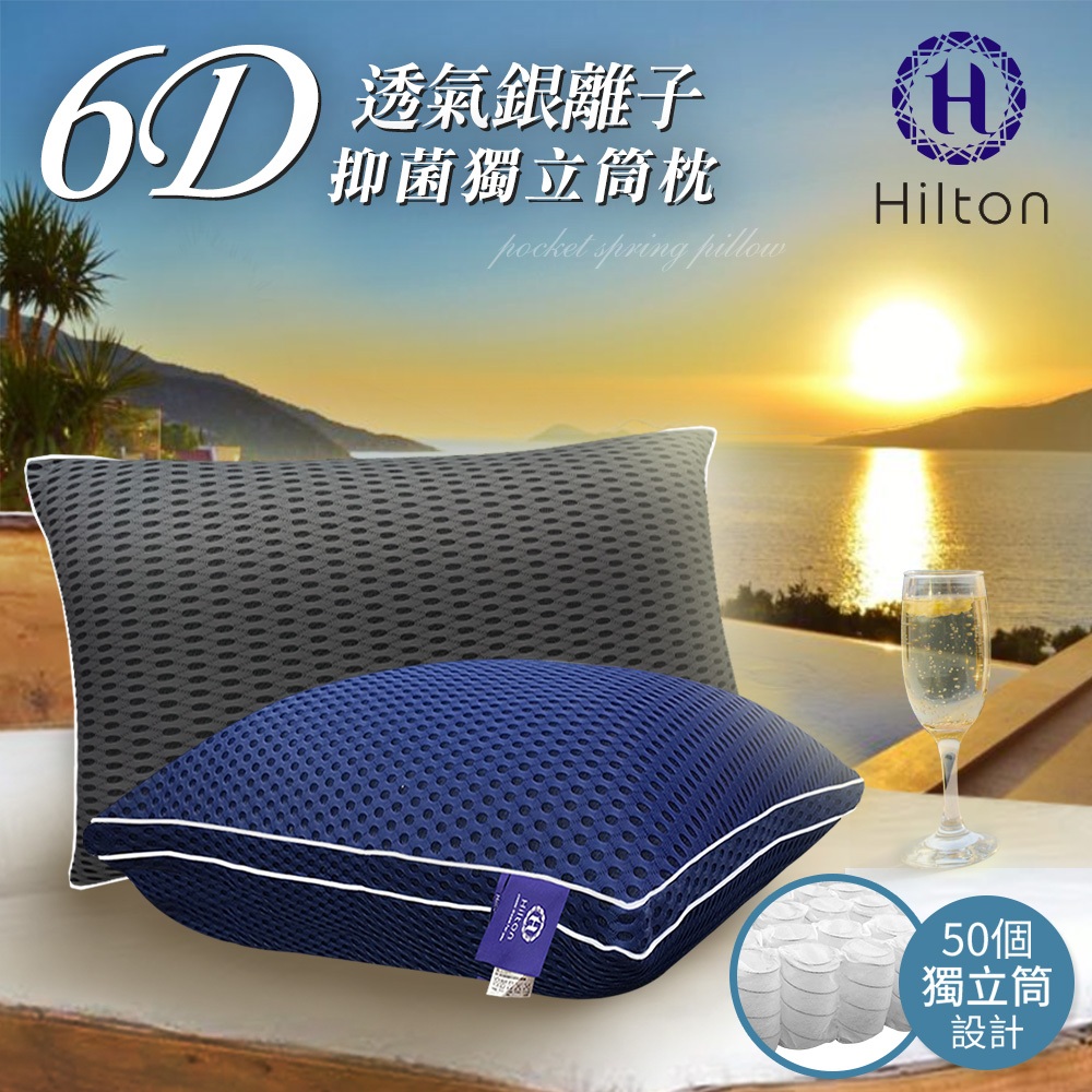 【Hilton 希爾頓】6D超涼感透氣銀離子抑菌獨立筒枕 二色任選 枕頭 涼感 時尚灰 經典藍