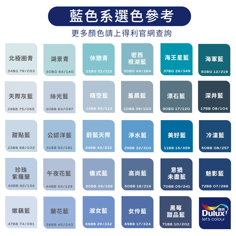 【得利官方旗艦店】A922 全效水泥漆 精選藍色系 電腦調色(3公升裝)|客製化調色漆50BG 44/184(客製色無退換)|23BB 68/102(客製色無退換)|50BB 08/257(客製色無退換)|44BB 54/129(客製色無退換)|50BB 39/188(客製色無退換)|69BB 17/324(客製色無退換)|34BG 79/053(客製色無退換)|14BB 55/113(客製色無退換)|90BG 17/120(客製色無退換)|56BB 45/240(客製色無退換)|71BB 10/202(客製色無退換)|30BG 64/140(客製色無退換)|23BG 51/212(客製色無退換)|10BB 39/100(客製色無退換)|21BB 52/181(客製色無退換)|11BB 15/359(客製色無退換)|44BB 62/134(客製色無退換)|50BG 12/219(客製色無退換)|30BB 63/097(客製色無退換)|72BB 07/288(客製色無退換)|37BG 26/349(客製色無退換)|17BB 08/104(客製色無退換)|25BB 32/310(客製色無退換)|24BB 43/232(客製色無退換)|50BB 18/216(客製色無退換)|47BB 74/091(客製色無退換)|66BB 29/332(客製色無退換)|29BB 75/065(客製色無退換)|70BB 09/241(客製色無退換)Wall Paints & CoatingsDulux得利塗料官方旗艦店