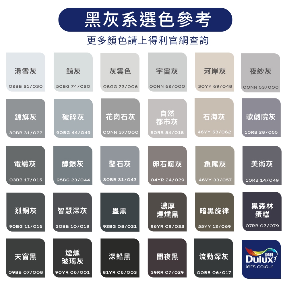 【得利官方旗艦店】A986 全效合一竹炭乳膠漆 精選黑灰色系 電腦調色(3公升裝)|客製化調色漆46YY 33/057(客製色無退換)|39RR 07/029(客製色無退換)|00NN 53/000(客製色無退換)|08GG 72/006(客製色無退換)|30BB 31/022(客製色無退換)|10RB 28/055(客製色無退換)|90YR 06/001(客製色無退換)|81YR 06/003(客製色無退換)|02BB 81/030(客製色無退換)|30YY 69/048(客製色無退換)|50RR 54/018(客製色無退換)|55YY 12/069(客製色無退換)|50BG 74/020(客製色無退換)|00NN 37/000(客製色無退換)|30BB 10/019(客製色無退換)|00NN 62/000(客製色無退換)|95BG 23/044(客製色無退換)|30BB 31/043(客製色無退換)|04YR 24/029(客製色無退換)|10RB 14/049(客製色無退換)|07RB 07/079(客製色無退換)|46YY 53/062(客製色無退換)|92BG 08/031(客製色無退換)|09BB 07/008(客製色無退換)|00BB 06/017(客製色無退換)|03BB 17/015(客製色無退換)|96YR 09/033(客製色無退換)|90BG 44/049(客製色無退換)|90BG 11/016(客製色無退換)Wall Paints & CoatingsDulux得利塗料官方旗艦店