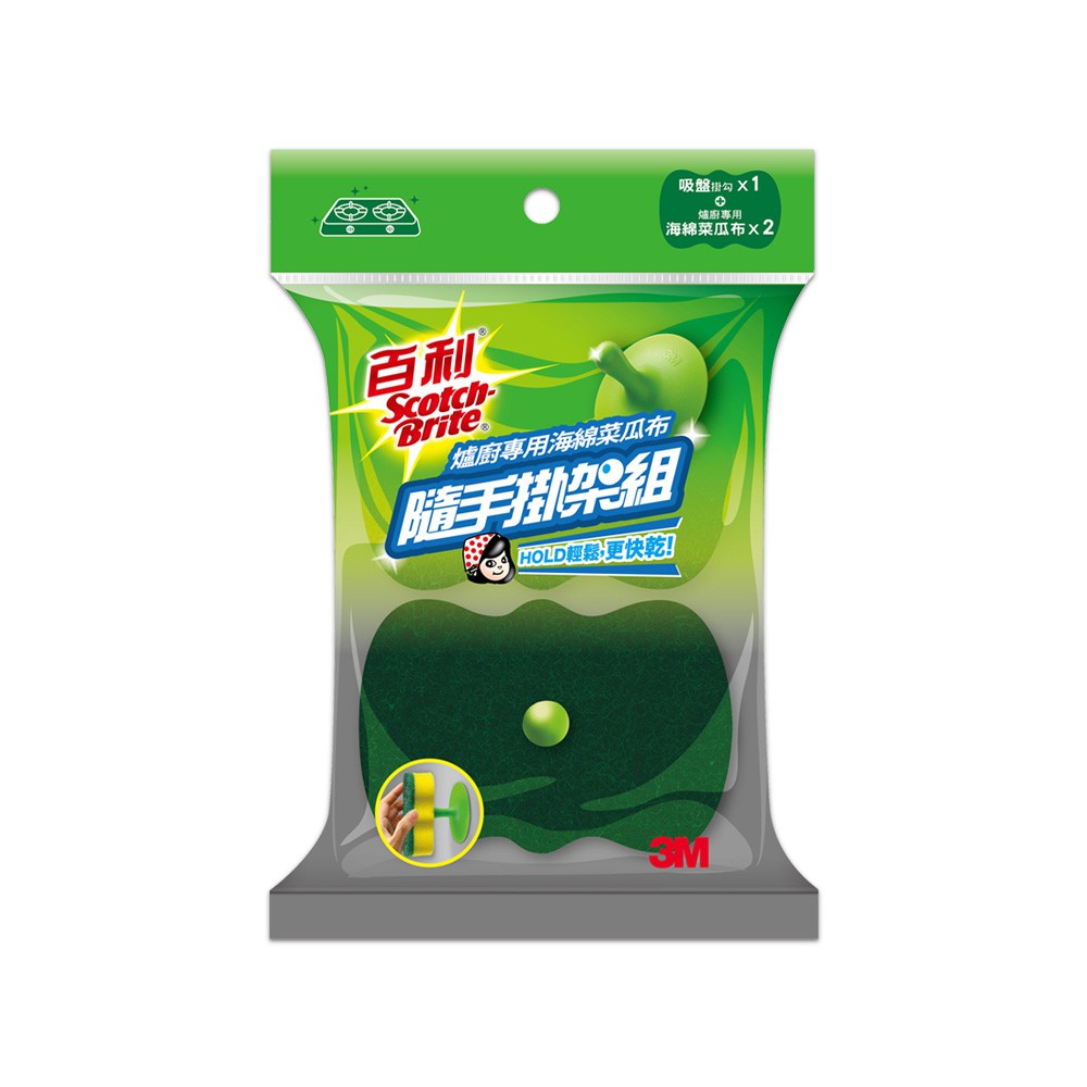 【Dr.Life生活館】3M 百利菜瓜布隨手掛架組-綠色吸盤(爐廚用海綿菜瓜布*2+綠色吸盤*1)原廠公司貨