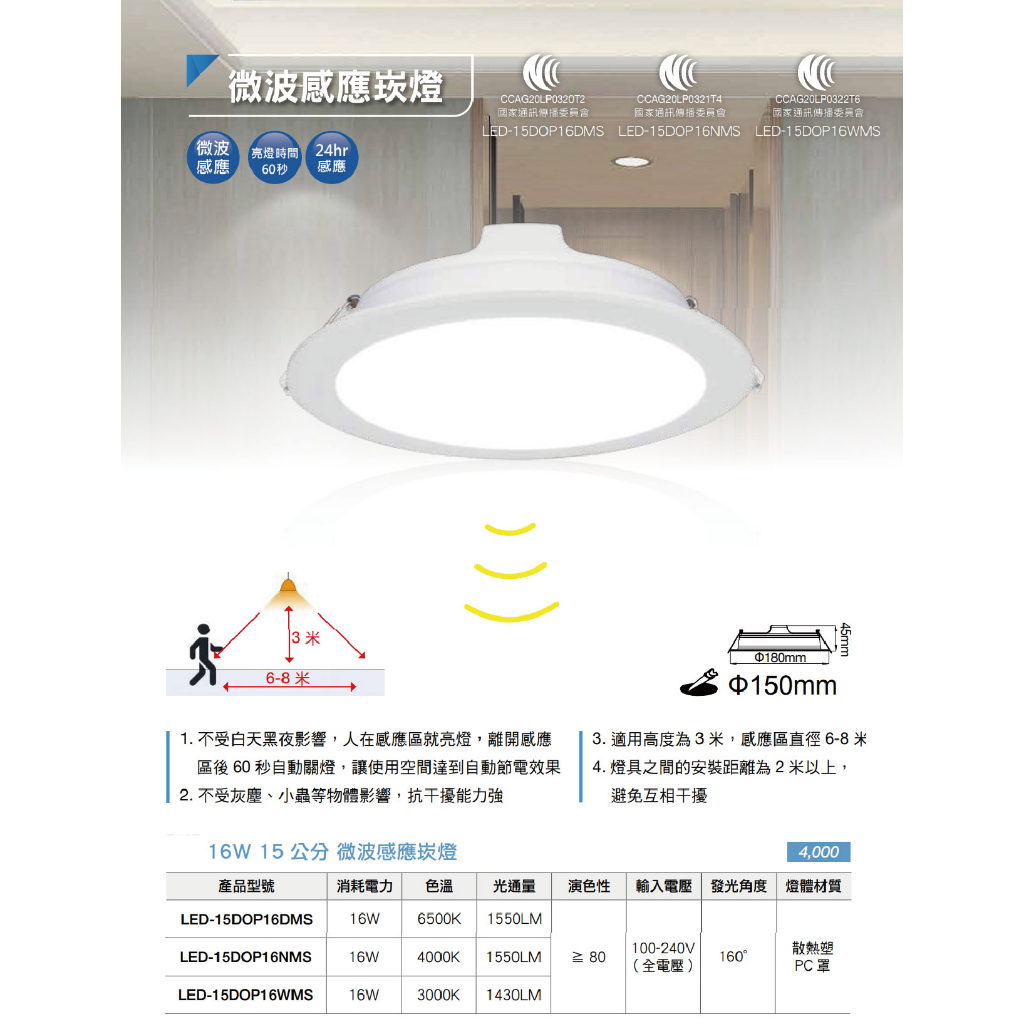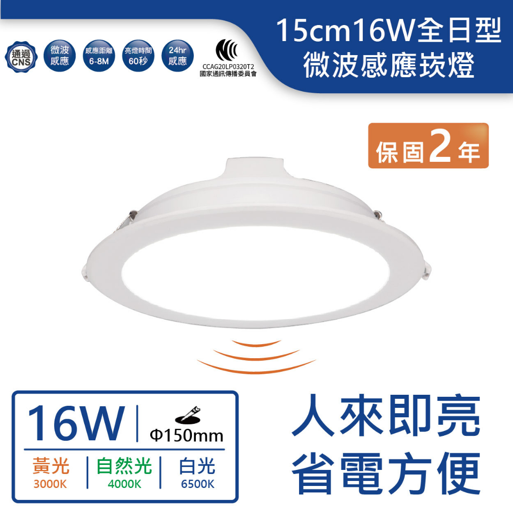 【舞光.LED】15cm 16W全日型微波感應崁燈(黃光/自然光/白光)【實體門市保固兩年】-15DOP16DMS6500K 白光|4000K 自然光|3000K 黃光DREAM LIGHTS 築光燈飾