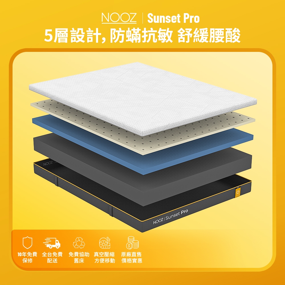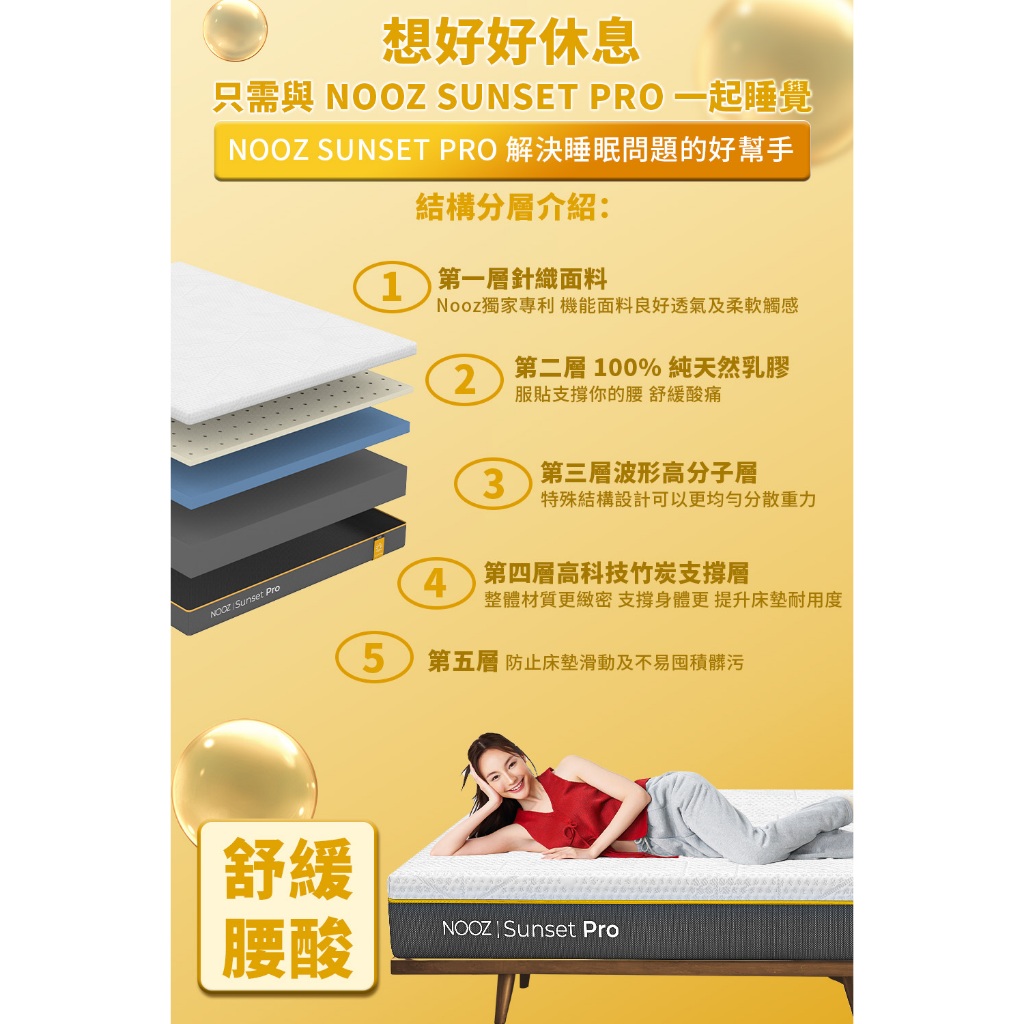 Nooz Sunset Pro乳膠床墊【腰酸背痛必備】非海綿/記憶棉 防蟎抗菌|加厚單人/雙人/雙人加大/雙人特大標準單人3呎 少量現貨|單人加大3.5呎 8/26陸續出貨|標準雙人5呎 少量現貨|雙人加大6呎 少量現貨|雙人特大6X7呎 8/26陸續出貨MattressesDreamlands精選名床|官方旗艦店Lunio / Nooz床墊