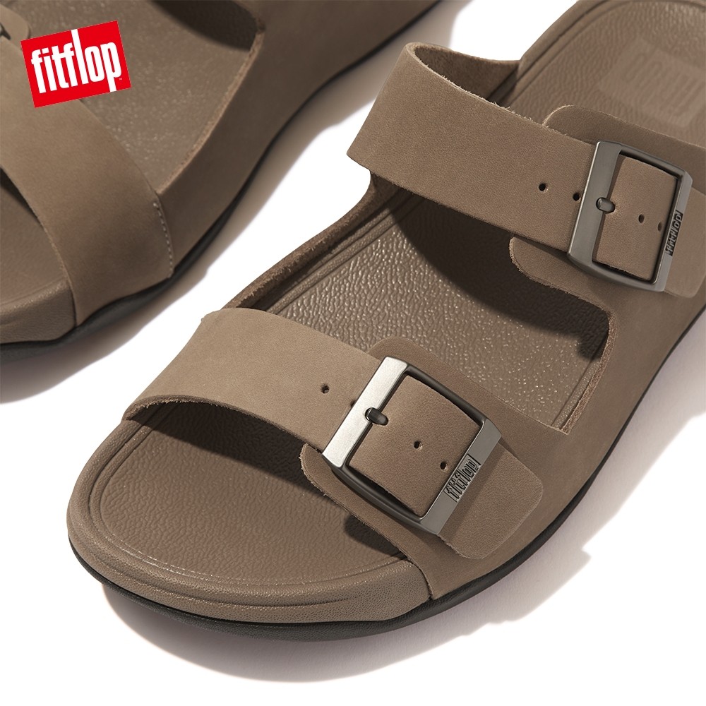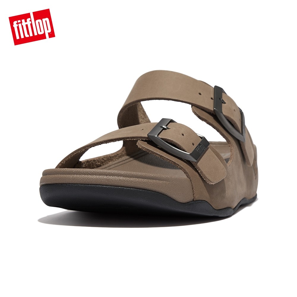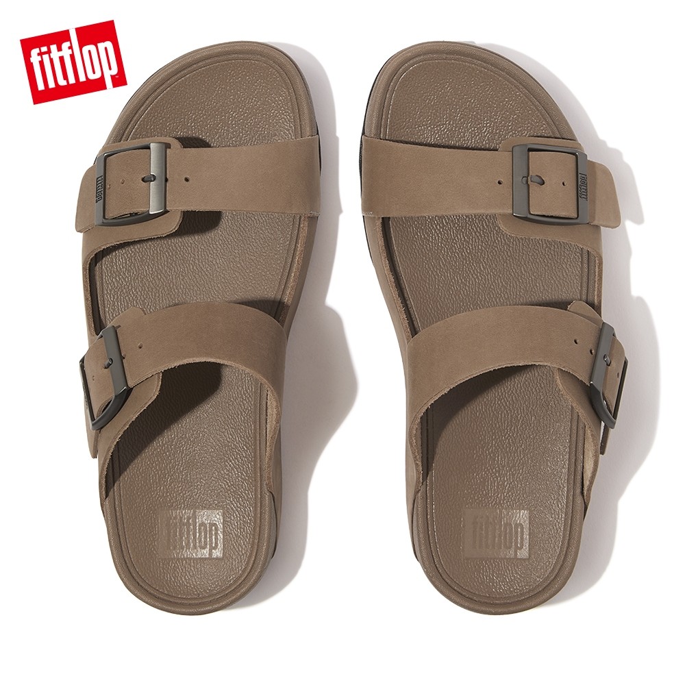 【FitFlop】GOGH MOC MENS BUCKLE LEATHER SLIDES 扣環皮革雙帶涼鞋-男(灰褐色)US10|US11|US8|US9SandalsFitFlop官方旗艦店