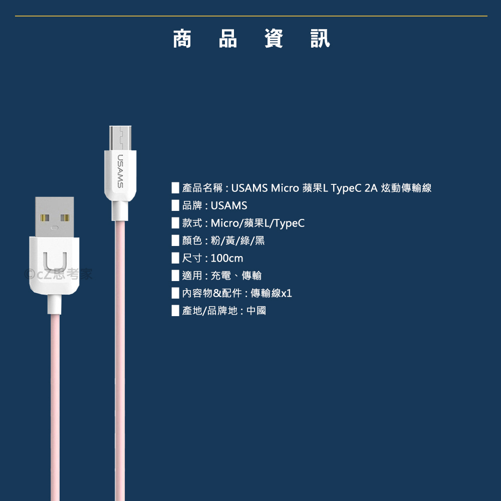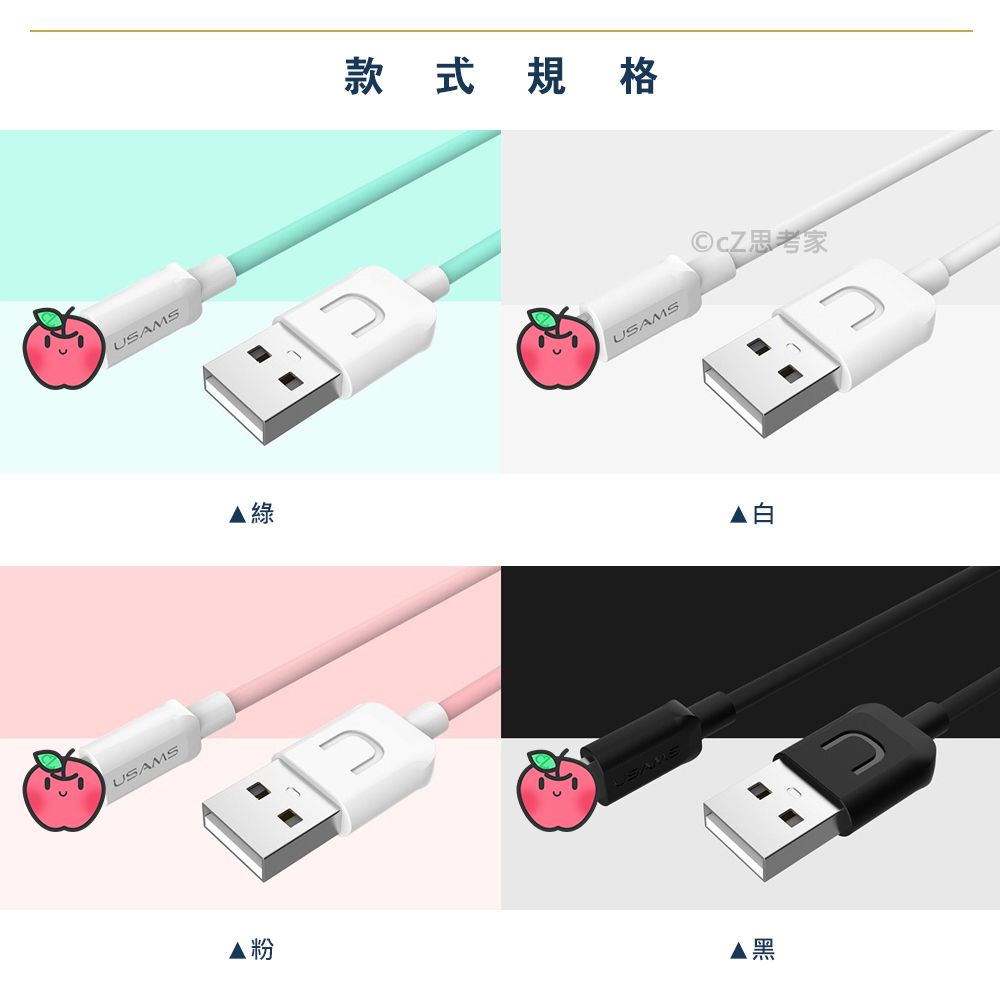 USAMS USB Micro 蘋果 TypeC 炫動傳輸線 充電線 快充線 蘋果線 充電線 APPLE線USB to L-黑|USB to L-白|USB to L-綠|USB to L-黃|USB to L-粉|USB to TypeC-黑|USB to TypeC-白|USB to TypeC-綠|USB to TypeC-黃|USB to TypeC-粉|USB to Micro-黑|USB to Micro-白|USB to Micro-綠|USB to Micro-黃|USB to Micro-粉Cables, Chargers & ConverterscZ思考家 – 3C手機配件